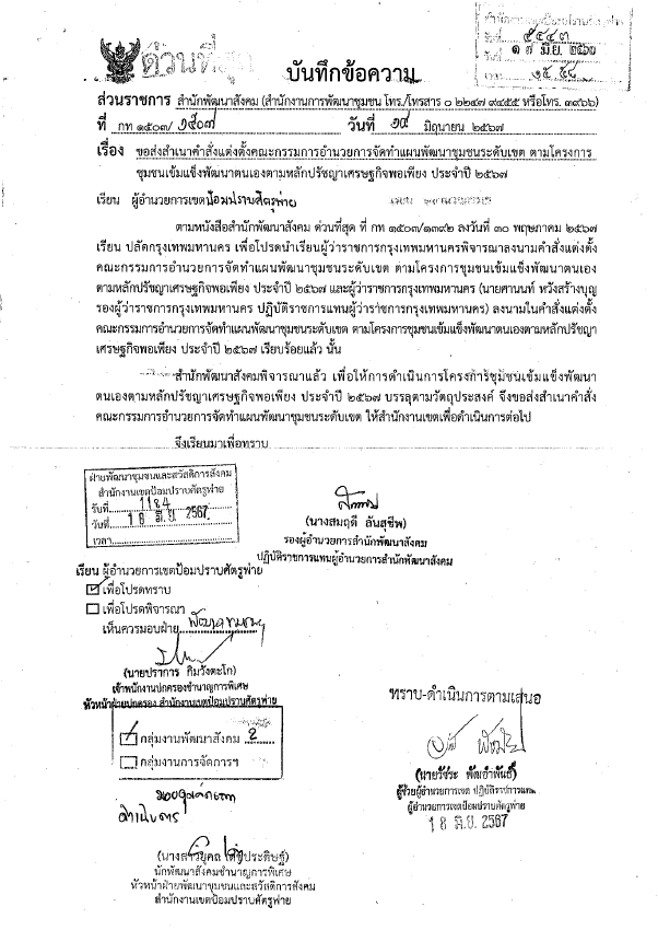 ![]() | 02-07-2024 | 0.00 | ![]() | สำนักงานเขตได้ส่งร่างคำสั่งแต่งตั้งคณะกรรมการอำนวยการจัดทำแผนพัฒนาชุมชนระดับเขตให้สำนักพัฒนาสังคมเพื่อเสนอร่างคำสั่งแต่งตั้งคณะกรรมการอำนวยการจัดทำแผนพัฒนาชุมชนระดับเขต ให้ผู้ว่าราชการกรุงเทพมหานครลงนาม โดยผู้ว่าราชการกรุงเทพมหานครลงนามคำสั่ง เมื่อวันที่ 12 มิถุนายน 2567 กำหนดจัดประชุม เพื่อพิจารณาอนุมัติโครงการ 2 ครั้ง ในวันที่ 9 และวันที่ 25 กรกฎาคม 2567 | |
