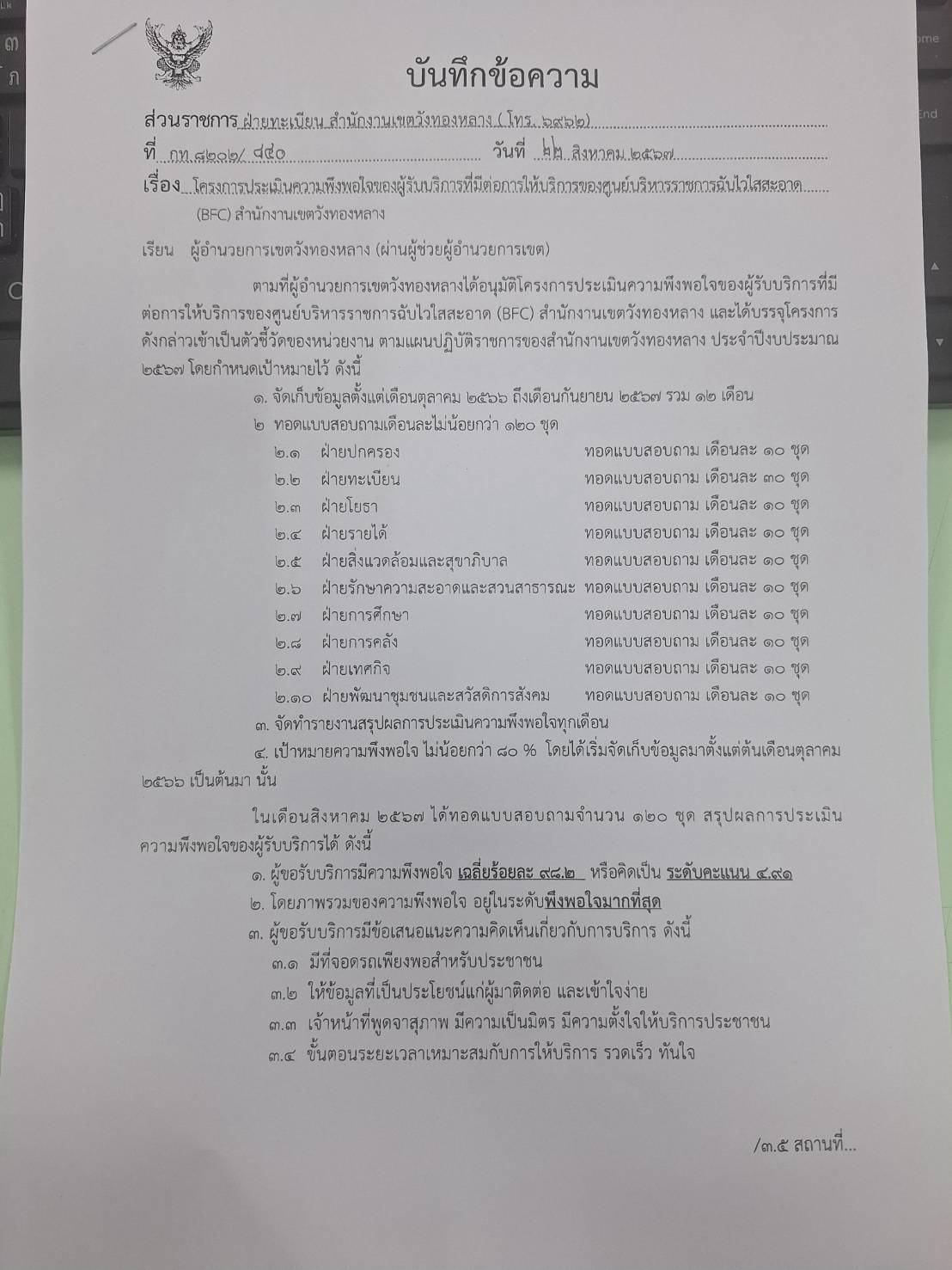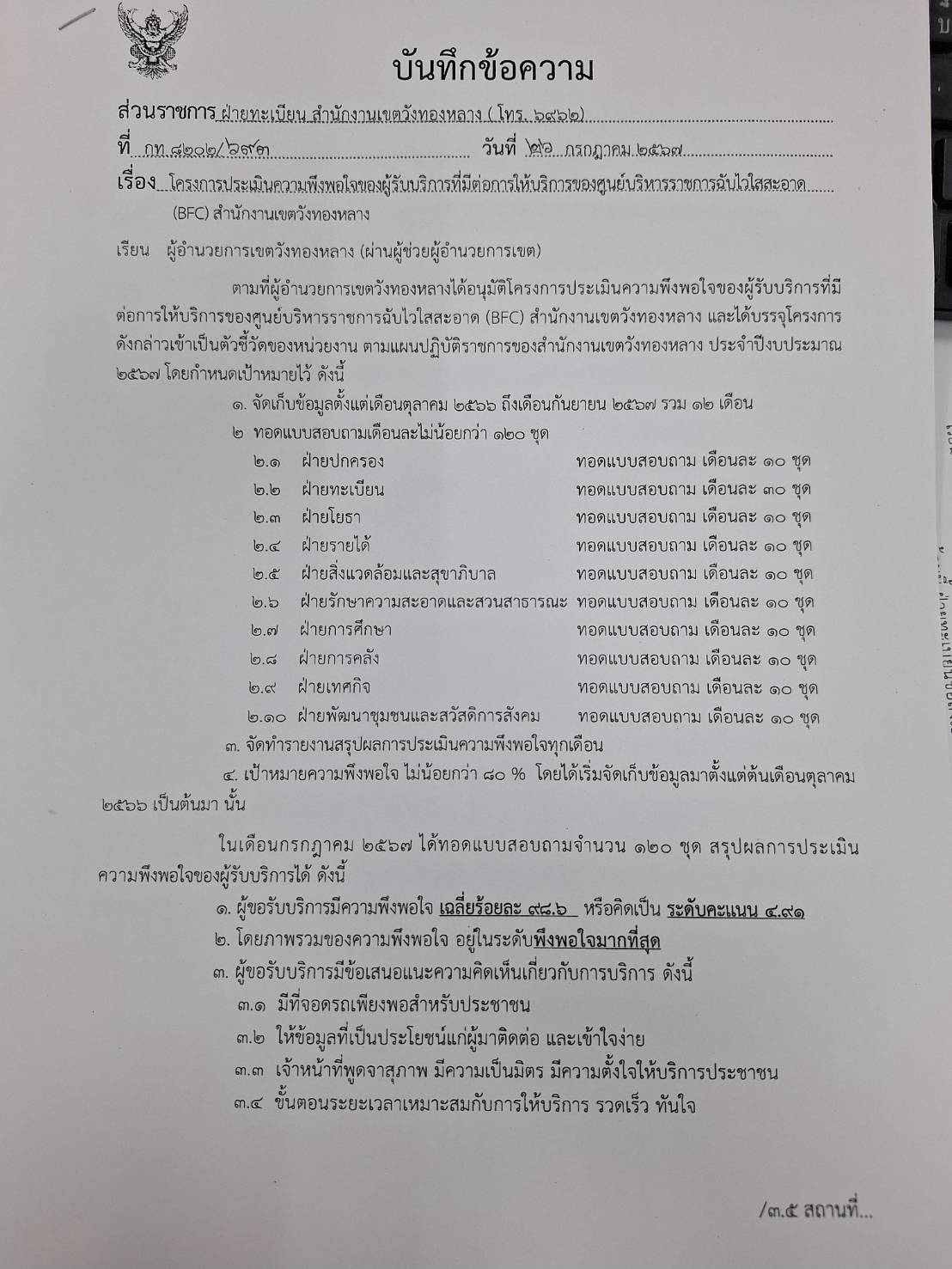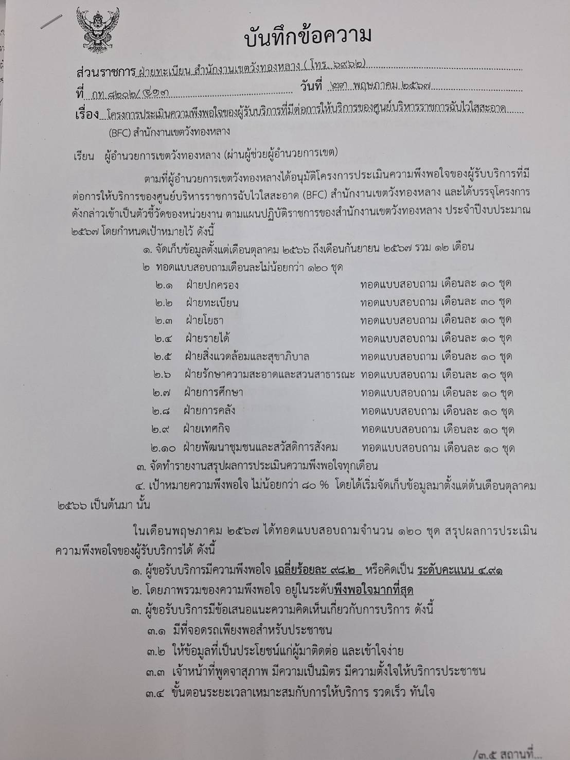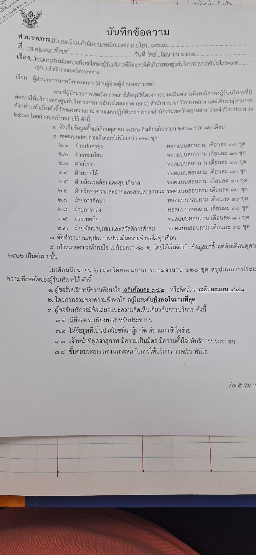 ![]() | - | กิจกรรมประเมินความพึงพอใจของผู้รับบริการที่มีต่อการให้บริการของศูนย์บริหารราชการฉับไวใสสะอาด (BFC) สำนักงานเขตวังทองหลาง | 0.00 | 90.00 | สำนักงานเขตวังทองหลาง | ฝ่ายทะเบียน |