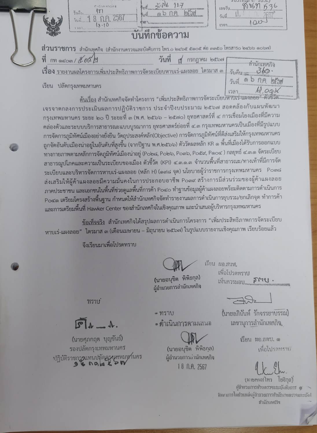 | 25-07-2024 | 4.00 |  | สำนักเทศกิจได้รายงานผลการดำเนินการโครงการเพิ่มประสิทธิภาพการจัดระเบียบผู้ค้าหาบเร่-แผงลอย ไตรมาส 3 เมื่อวันที่ 8 กรกฎาคม 2567 ซึ่งนายศุภกฤต บุญขันธ์ รองปลัดกรุงเทพมหานคร ปฏิบัติราชการแทนปลัดกรุงเทพมหานครทราบ เมื่อวันที่ 15 กรกฎาคม 2567 | |