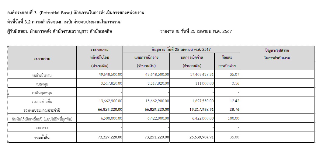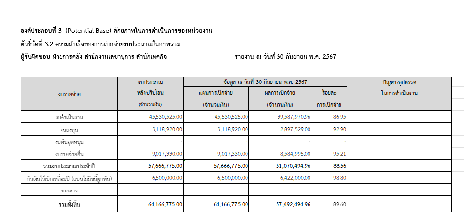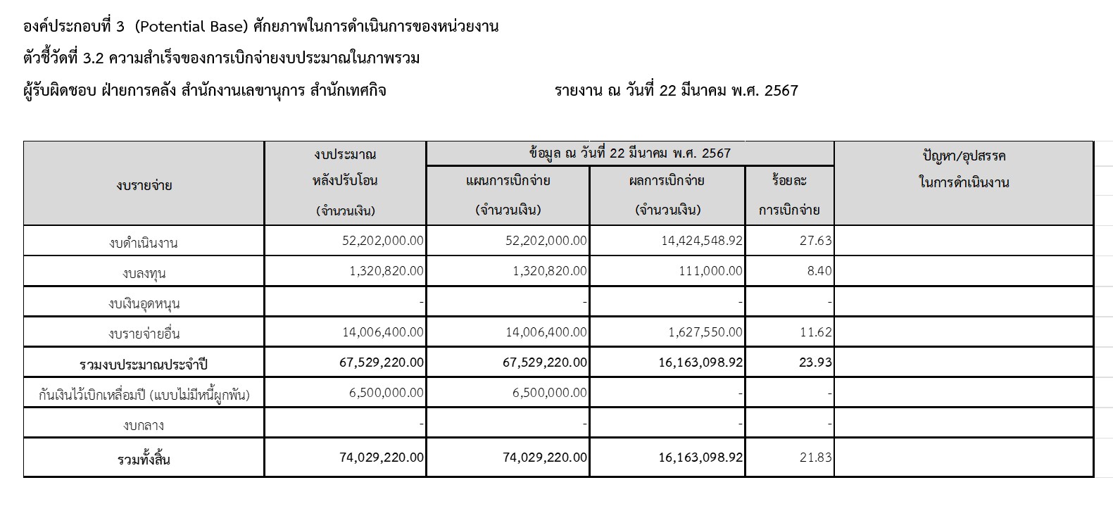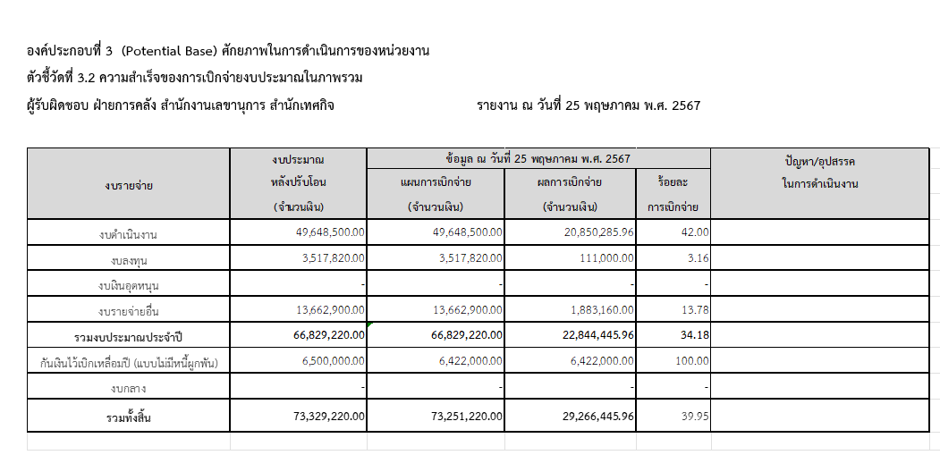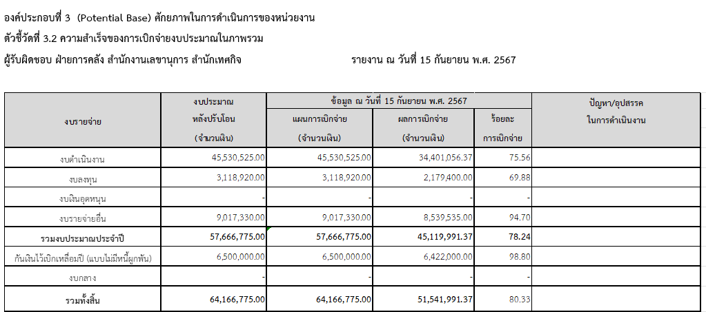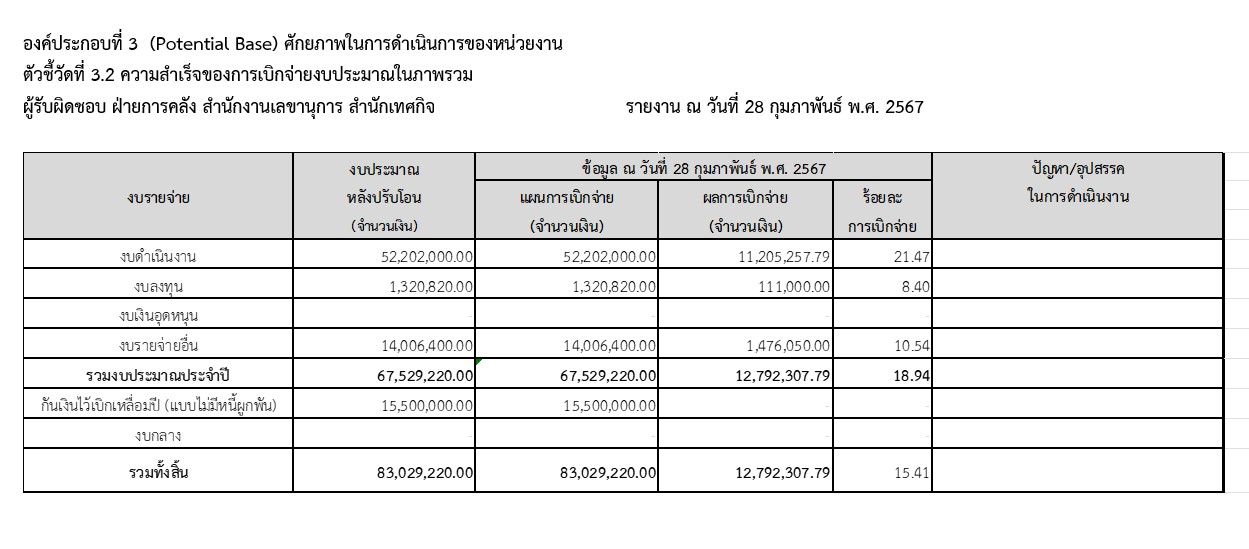 5 | เบิกจ่ายงบประมาณในภาพรวมเกินร้อยละ 30 | 10.00 | 01-02-2024 | 29-02-2024 |
