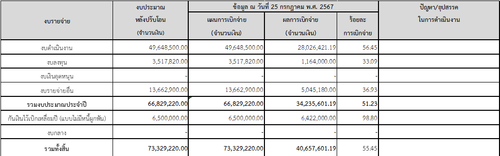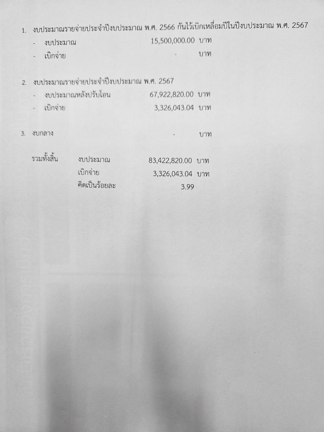 ![]() | 15-09-2024 | 80.33 | ![]() | 1.งบประมาณ พ.ศ.2567 งบประมาณหลังปรับโอน 57,666,775.00 บาท เบิกจ่าย 45,119,991.37 บาท 2.กันไว้เบิกเหลื่อมปี งบประมาณ 6,500,000 บาท เบิกจ่าย 6,422.000 บาท 3.งบกลาง ยังไม่มีรายการ รวมทั้งสิ้น งบประมาณ 64,166,775.00 บาท เบิกจ่าย 51,541,991.37 บาท คิดเป็น 80.33% | |