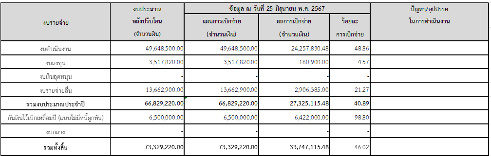 ![]() | 30-11-2023 | 3.99 | ![]() | งบประมาณ 83,422,820.00 บาท เบิกจ่าย 3,326,043.04 บาท คิดเป็นร้อยละ 3.99 | |