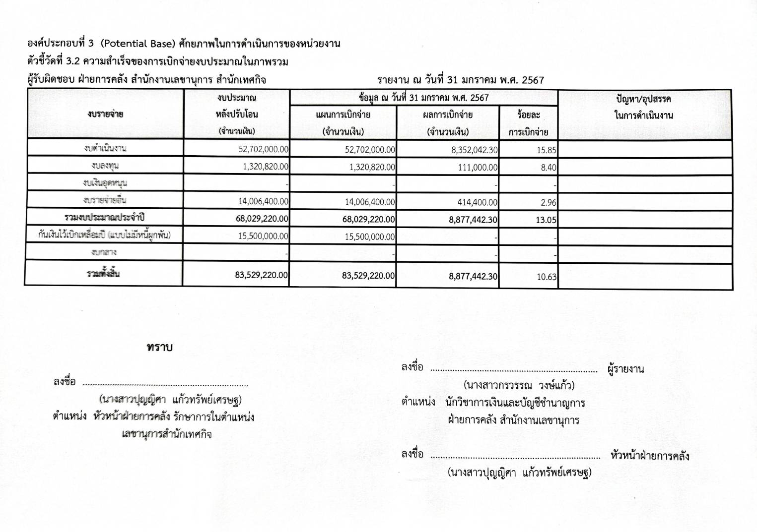 4 | เบิกจ่ายงบประมาณในภาพรวมเกินร้อยละ 20 | 10.00 | 01-01-2024 | 31-01-2024 |