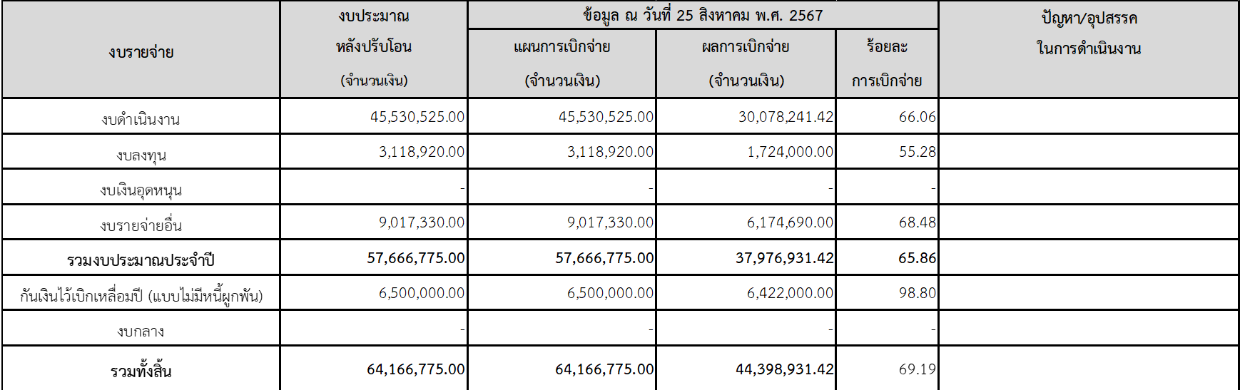 ![]() | 25-08-2024 | 69.19 | ![]() | 1.งบประมาณ พ.ศ.2567 งบประมาณหลังปรับโอน 57,666,775.00 บาท เบิกจ่าย 37,976,931.42 บาท 2.กันไว้เบิกเหลื่อมปี งบประมาณ 6,500,000 บาท เบิกจ่าย 6,422,000 บาท 3.งบกลาง ยังไม่มีรายการ รวมทั้งสิ้น งบประมาณ 64,166,775 บาท เบิกจ่าย 44,398,931.42 บาท คิดเป็น 69.19% | |