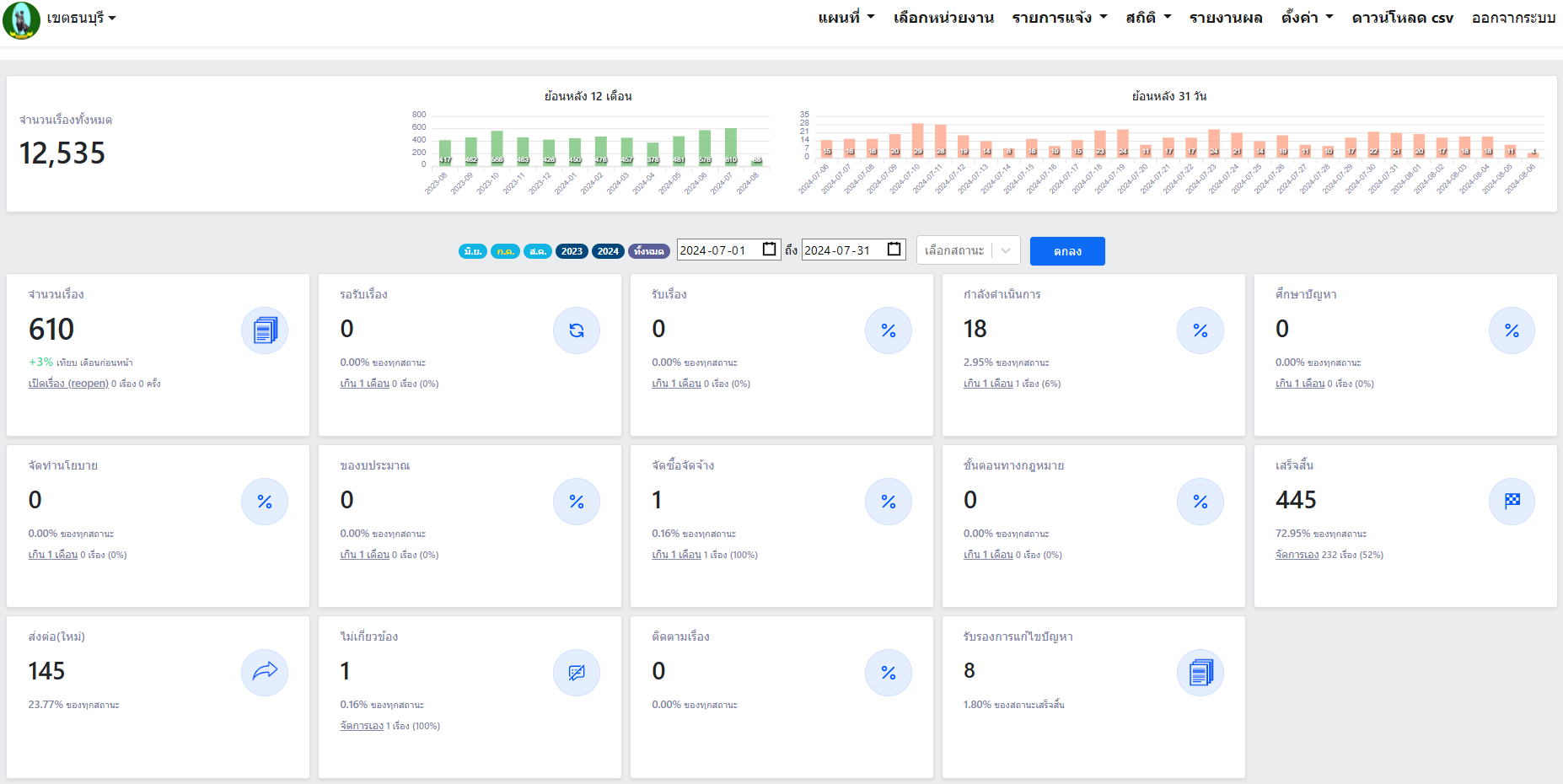 ![]() | 31-07-2024 | 0.00 | ![]() | รายงานผลเดือนกรกฎาคม พ.ศ. 2567 ตั้งแต่วันที่ 1 กรกฎาคม - 31 กรกฎาคม 2567 มีผู้ร้องเรียนผ่านระบบ Traffy Fondue จำนวน 610 เรื่อง ดำเนินการแก้ไขสำเร็จแล้ว 445 เรื่อง คิดเป็นร้อยละ 72.95 | |