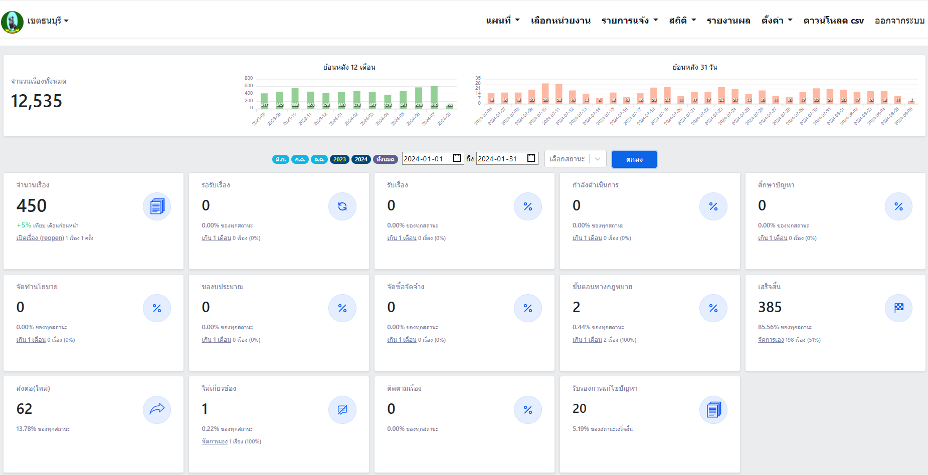 ![]() | 30-01-2024 | 0.00 | ![]() | รายงานผลเดือนมกราคม พ.ศ. 2567 ตั้งแต่วันที่ 1 มกราคม - 31 มกราคม 2567 มีผู้ร้องเรียนผ่านระบบ Traffy Fondue จำนวน 450 เรื่อง ดำเนินการแก้ไขสำเร็จแล้ว 385 เรื่อง คิดเป็นร้อยละ 85.56 | |