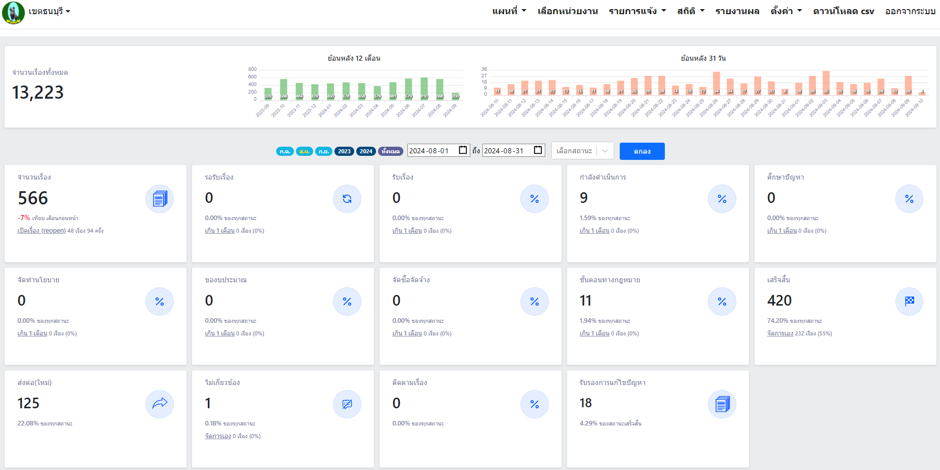 ![]() | 09-09-2024 | 0.00 | ![]() | รายงานผลเดือนสิงหาคม พ.ศ. 2567 ตั้งแต่วันที่ 1 สิงหาคม - 31 สิงหาคม 2567 มีผู้ร้องเรียนผ่านระบบ Traffy Fondue จำนวน 566 เรื่อง ดำเนินการแก้ไขสำเร็จแล้ว 420 เรื่อง คิดเป็นร้อยละ 74.20 | |