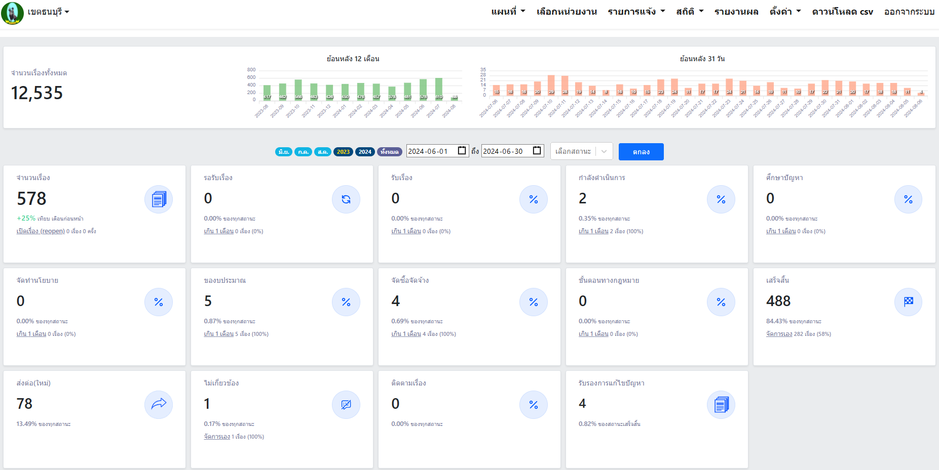![]() | 31-07-2024 | 0.00 | ![]() | รายงานผลเดือนมิถุนายน พ.ศ 2567 ตั้งแต่วันที่ 1 มิถุนายน - 30 มิถุนายน 2567 มีผู้ร้องเรียนผ่านระบบ Traffy Fondue จำนวน 578 เรื่อง ดำเนินการแก้ไขสำเร็จแล้ว 488 เรื่อง คิดเป็นร้อยละ 84.43 | |