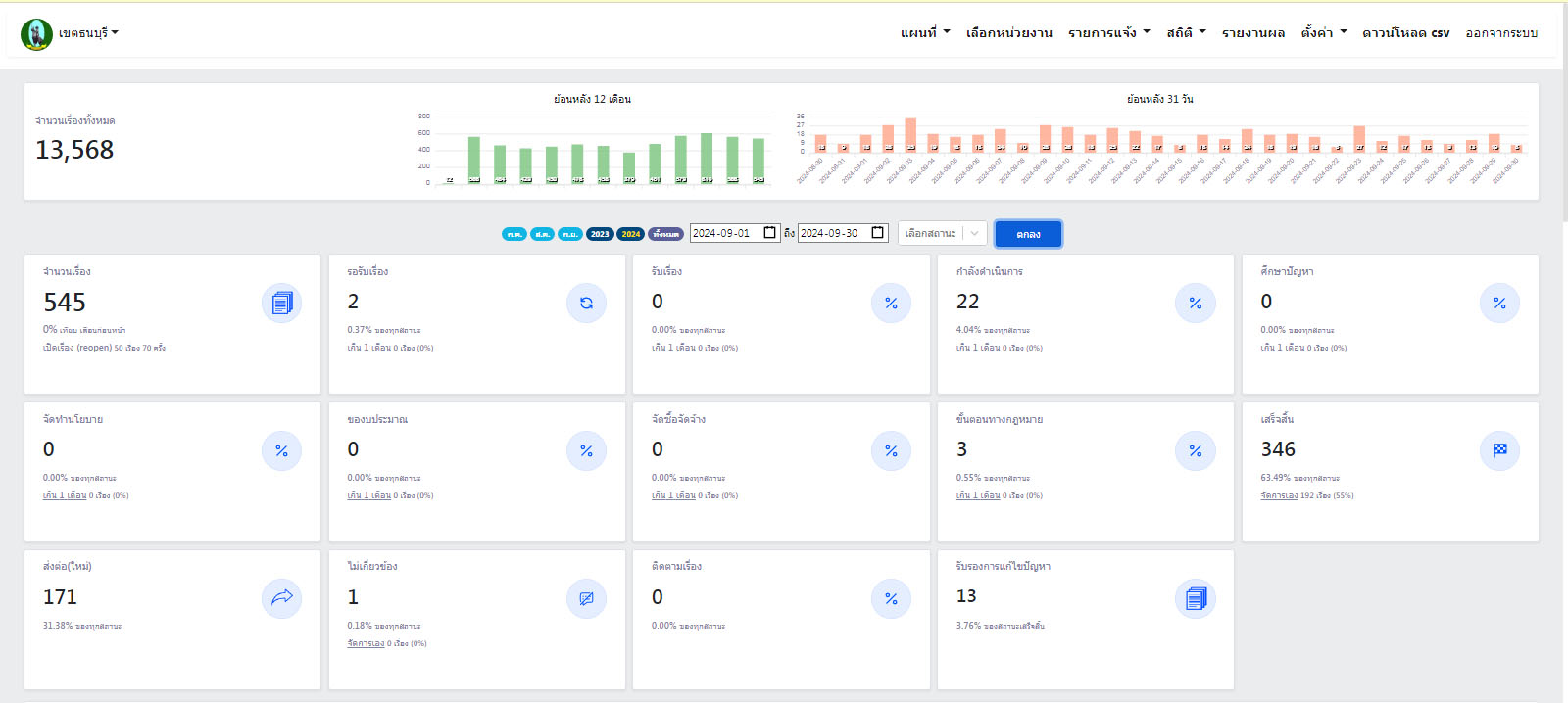 ![]() | 30-09-2024 | 0.00 | ![]() | รายงานผลเดือนกันยายน พ.ศ. 2567 ตั้งแต่วันที่ 1 กันยายน - 30 กันยายน 2567 มีผู้ร้องเรียนผ่านระบบ Traffy Fondue จำนวน 545 เรื่อง ดำเนินการแก้ไขสำเร็จแล้ว 346 เรื่อง คิดเป็นร้อยละ 63.49 | |