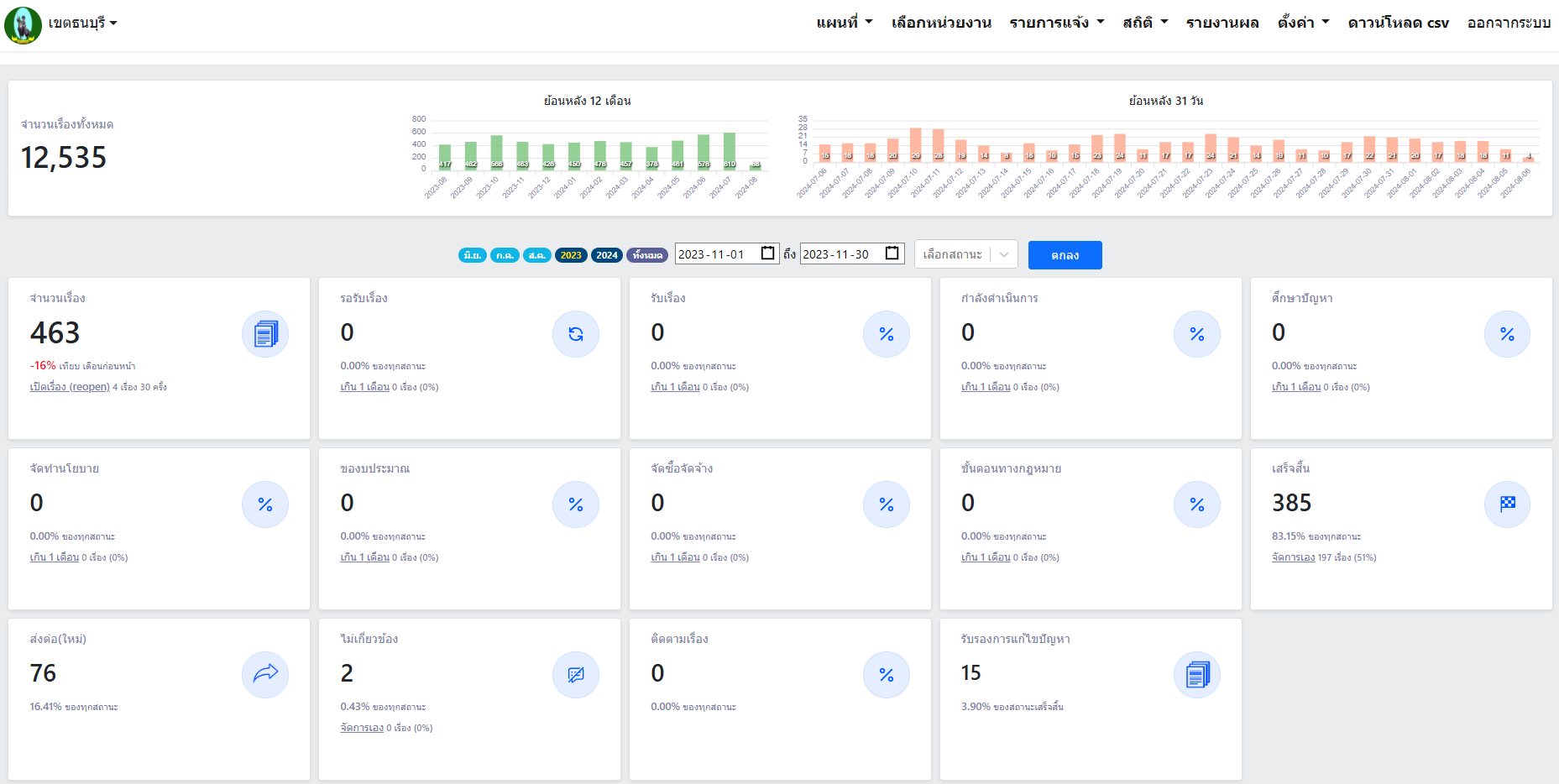 ![]() | 30-11-2023 | 0.00 | ![]() | รายงานผลเดือนพฤศจิกายน พ.ศ. 2566 ตั้งแต่วันที่ 1 พฤศจิกายน - 30 พฤศจิกายน 2566 มีผู้ร้องเรียนผ่านระบบ Traffy Fondue จำนวน 463 เรื่อง ดำเนินการแก้ไขสำเร็จแล้ว 385 เรื่อง คิดเป็นร้อยละ 83.15 | |