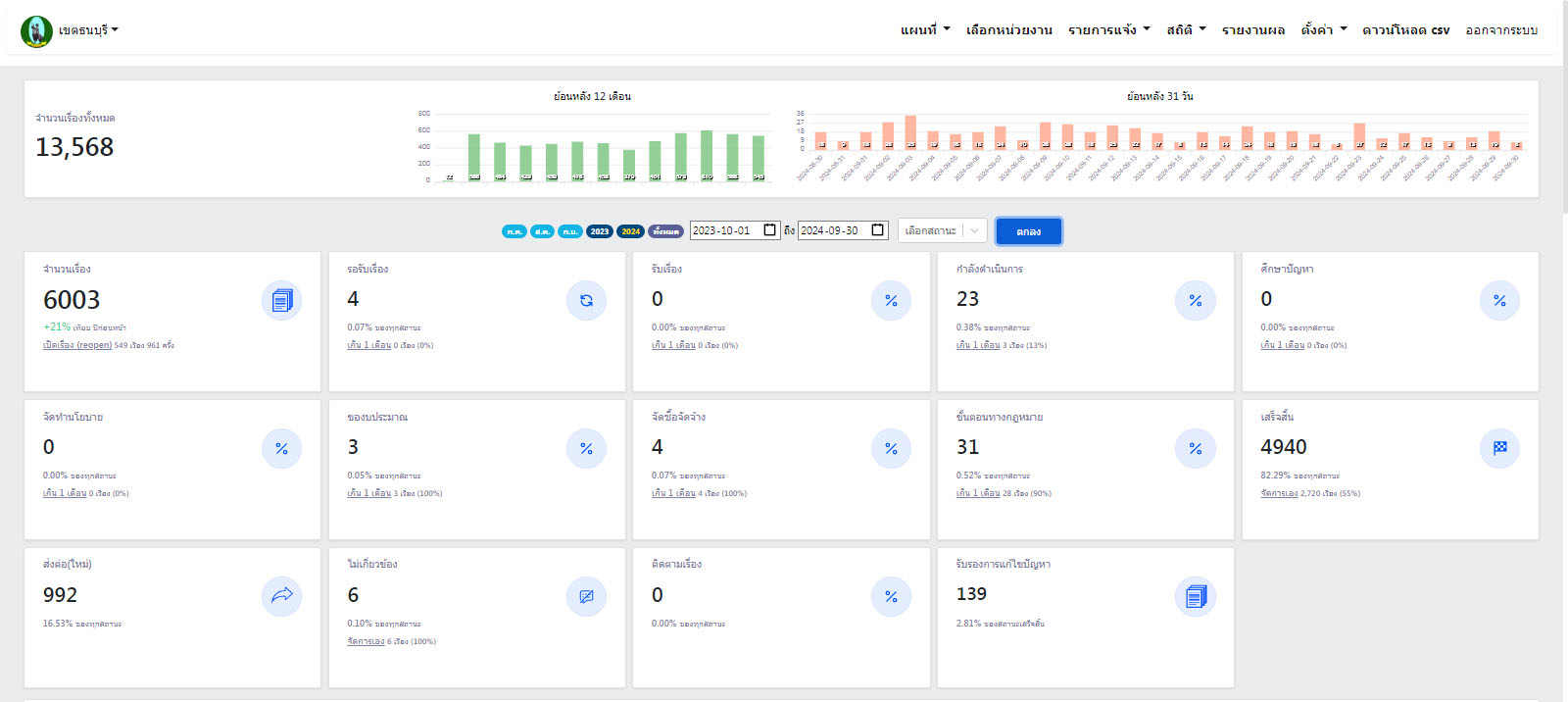![]() | 30-09-2024 | 82.29 | ![]() | รายงานผลปีงบประมาณ พ.ศ. 2567 ตั้งแต่วันที่ 1 ตุลาคม 2566 - 30 กันยายน 2567 มีผู้ร้องเรียนผ่านระบบ Traffy Fondue จำนวน 6,003 เรื่อง ดำเนินการแก้ไขสำเร็จแล้ว 4,940 เรื่อง คิดเป็นร้อยละ 82.29 |