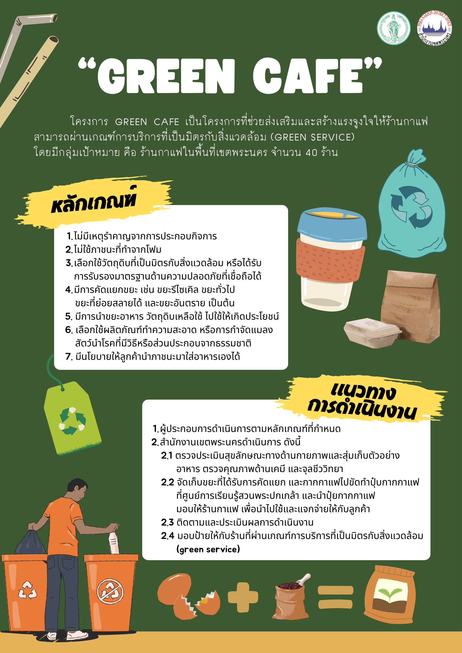 27-04-202430.001. จัดประชุมผู้ประกอบการ ชี้แจงแนวทางและประชาสัมพันธ์ร้านเข้าร่วมโครงการฯ 2. ตรวจประเมินด้านสุขลักษณะตามเกณฑ์การมีบริการที่เป็นมิตรกับสิ่งแวดล้อม 3. กำหนดแผนในการจัดเก็บกากกาแฟ เศษผัก ผลไม้ เพื่อนำไปผลิตเป็นปุ๋ย