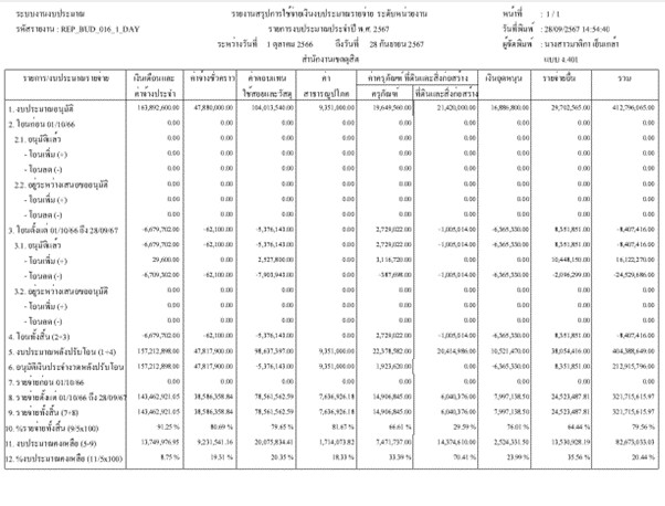 ![]() | 28-09-2024 | 3.55 | ![]() | ดำเนินการเบิกจ่ายงบประมาณในภาพรวม ณ วันที่ 27 กันยายน 2567 คิดเป็นร้อยละ 79.56 ยอดเงิน 321,715,615.97 บาท มีรายละเอียดดังนี้ 1. หมวดเงินเดือนและค่าจ้างประจำ 143,462,921.05 บาท 2. หมวดค่าจ้างชั่วคราว 38,586,758.84 บาท 3. หมวดค่าตอบแทนใช้สอยและวัสดุ 78,561,562.59 บาท 4. หมวดค่าสาธารณูปโภค 7,636,926.18 บาท 5. หมวดค่าครุภัณฑ์ที่ดินและสิ่งก่อสร้าง 20,947,221 บาท 6. หมวดเงินอุดหนุน 7,997,138.50 บาท 7. หมวดรายจ่ายอื่น 24,523,487.81 บาท | |