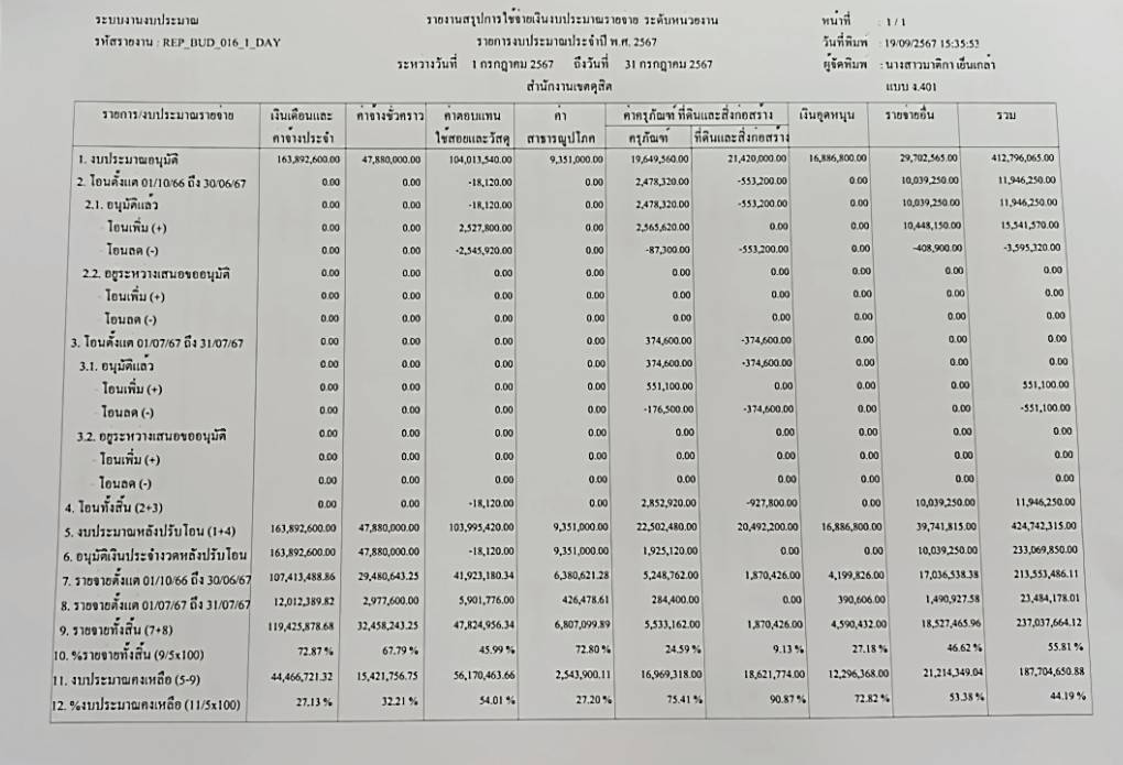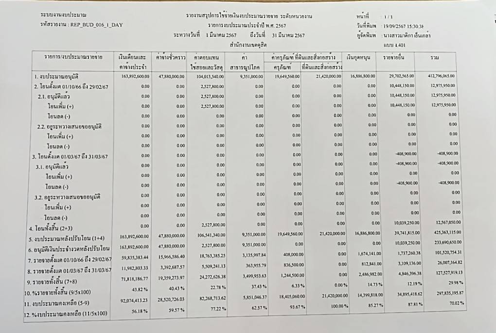 ![]() | 19-09-2024 | 6.14 | ![]() | ดำเนินการเบิกจ่ายงบประมาณในภาพรวม ณ วันที่ 27 มีนาคม 2567 คิดเป็นร้อยละ 6.14 ยอดเงิน 26,007,164.82 บาท มีรายละเอียดดังนี้ 1. หมวดเงินเดือนและค่าจ้างประจำ 11,982,803.33 บาท 2. หมวดค่าจ้างชั่วคราว 3,392,687.57 บาท 3. หมวดค่าตอบแทนใช้สอยและวัสดุ 5,509,241.13 บาท 4. หมวดค่าสาธารณูปโภค 363,955.79 บาท 5. หมวดค่าครุภัณฑ์ที่ดินและสิ่งก่อสร้าง 836,500.- บาท 6. หมวดเงินอุดหนุน 812,841.- บาท 7. หมวดรายจ่ายอื่น 3,109,136.- บาท | |