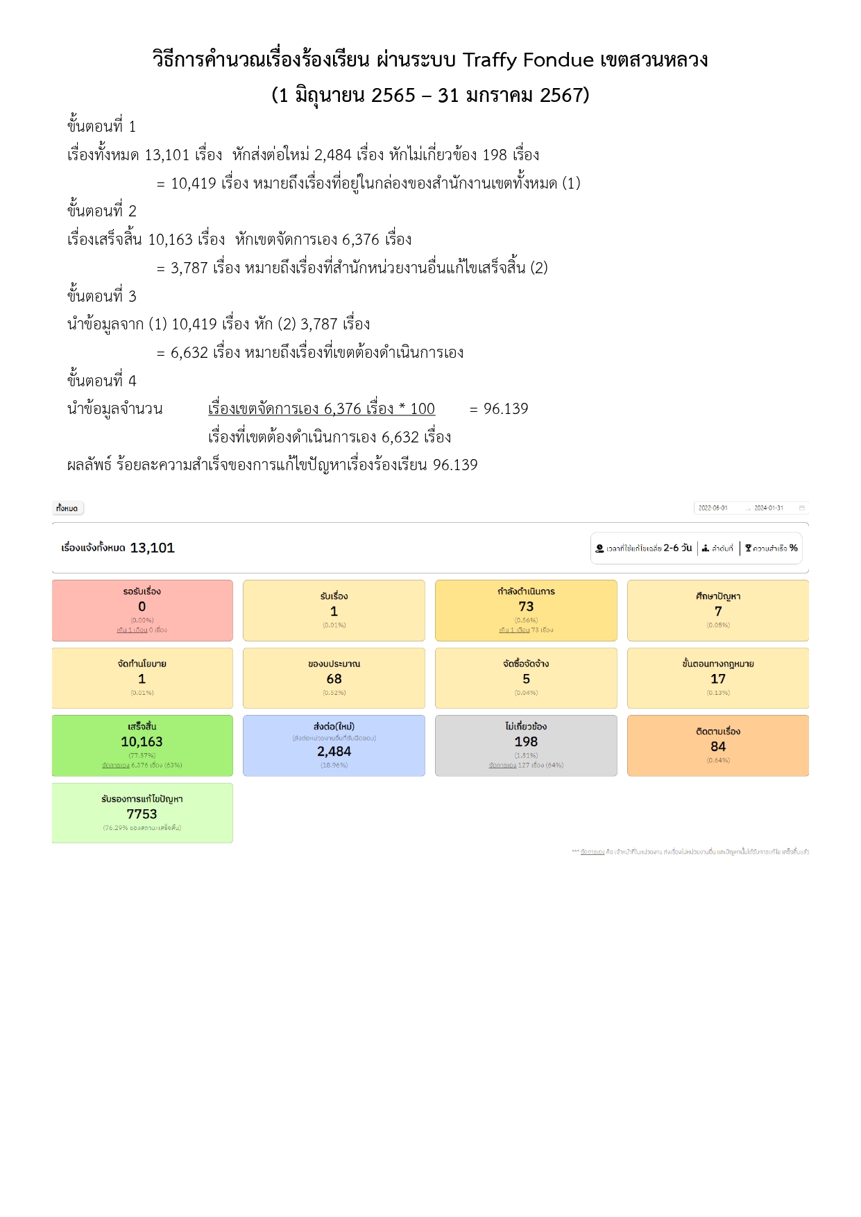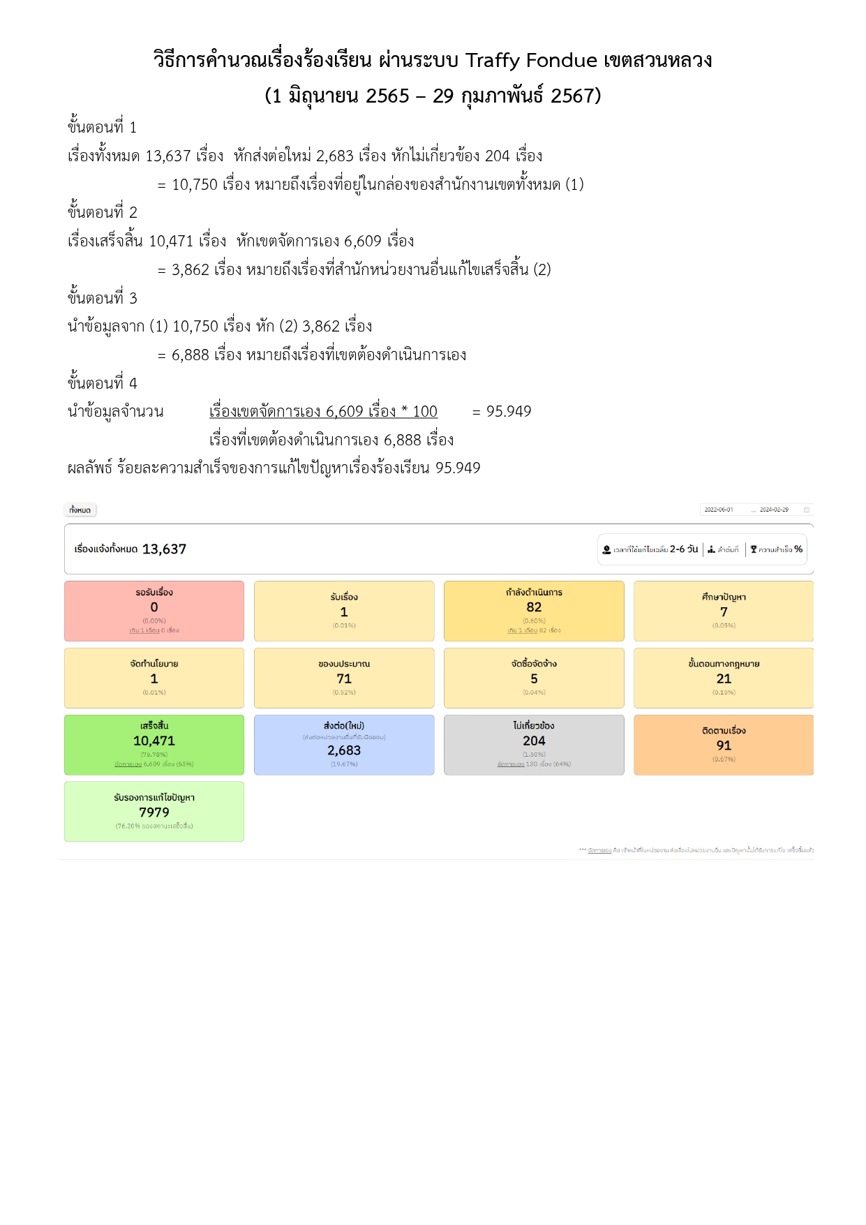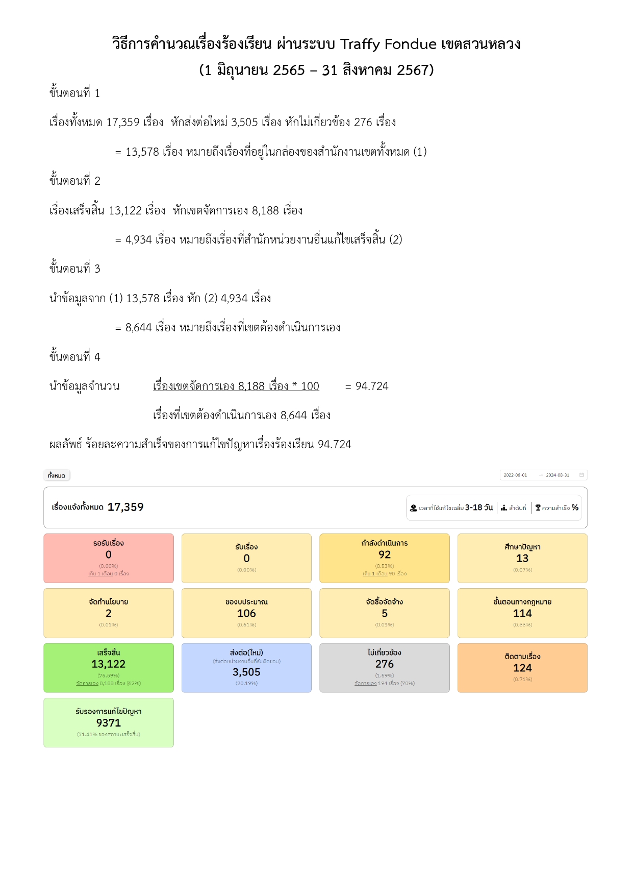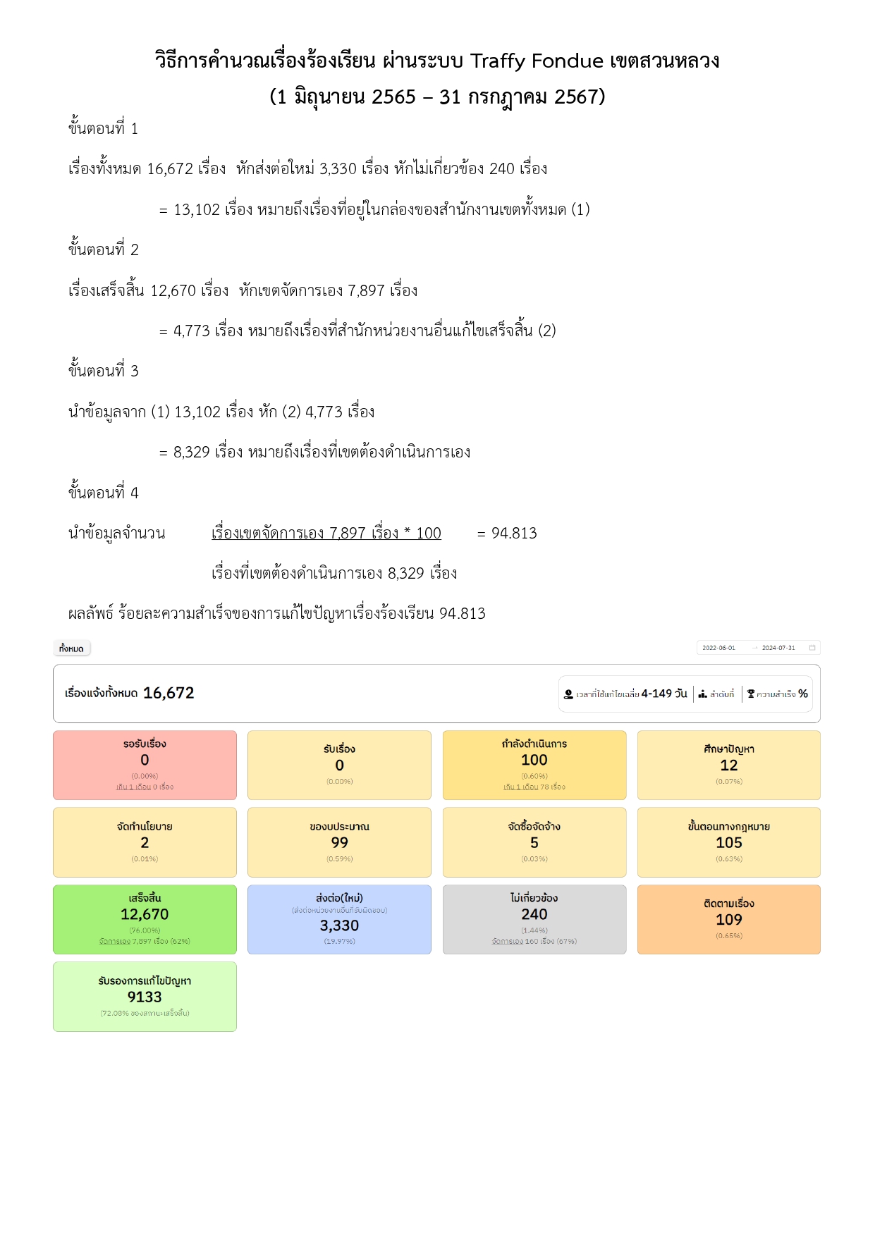 ![]() | 31-01-2024 | 96.14 | ![]() | รับเรื่องร้องเรียน ตั้งแต่วันที่ 1 มิถุนายน 65 - 31 มกราคม 67 ขั้นตอนที่ 1 เรื่องทั้งหมด 13,101 เรื่อง หักส่งต่อใหม่ 2,484 เรื่อง หักไม่เกี่ยวข้อง 198 เรื่อง = 10,419 เรื่อง หมายถึงเรื่องที่อยู่ในกล่องของสำนักงานเขตทั้งหมด (1) ขั้นตอนที่ 2 เรื่องเสร็จสิ้น 10,163 เรื่อง หักเขตจัดการเอง 6,376 เรื่อง = 3,787 เรื่อง หมายถึงเรื่องที่สำนักหน่วยงานอื่นแก้ไขเสร็จสิ้น (2) ขั้นตอนที่ 3 นำข้อมูลจาก (1) 10,419 เรื่อง หัก (2) 3,787 เรื่อง = 6,632 เรื่อง หมายถึงเรื่องที่เขตต้องดำเนินการเอง ขั้นตอนที่ 4 นำข้อมูลจำนวน เรื่องเขตจัดการเอง 6,376 เรื่อง * 100 = 96.139 เรื่องที่เขตต้องดำเนินการเอง 6,632 เรื่อง ผลลัพธ์ ร้อยละความสำเร็จของการแก้ไขปัญหาเรื่องร้องเรียน 96.139 | |