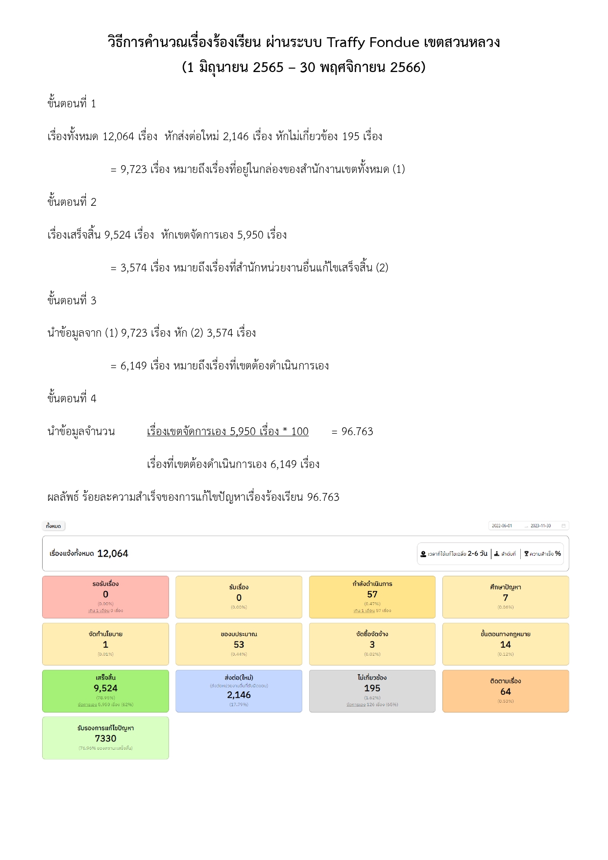 ![]() | 30-11-2023 | 96.88 | ![]() | รับเรื่องร้องเรียน ตั้งแต่วันที่ 1 มิถุนายน 65 - 31 ตุลาคม 2566 ขั้นตอนที่ 1 เรื่องทั้งหมด 11,501 เรื่อง หักส่งต่อใหม่ 1,985 เรื่อง หักไม่เกี่ยวข้อง 186 เรื่อง = 9,333 เรื่อง หมายถึงเรื่องที่อยู่ในกล่องของสำนักงานเขตทั้งหมด (1) ขั้นตอนที่ 2 เรื่องเสร็จสิ้น 9,149 เรื่อง หักเขตจัดการเอง 5,720 เรื่อง = 3,429 เรื่อง หมายถึงเรื่องที่สำนักหน่วยงานอื่นแก้ไขเสร็จสิ้น (2) ขั้นตอนที่ 3 นำข้อมูลจาก (1) 9,333 เรื่อง หัก (2) 3,429 เรื่อง = 5,904 เรื่อง หมายถึงเรื่องที่เขตต้องดำเนินการเอง ขั้นตอนที่ 4 นำข้อมูลจำนวน เรื่องเขตจัดการเอง 5,720 เรื่อง * 100 = 96.883 เรื่องที่เขตต้องดำเนินการเอง 5,904 เรื่อง ผลลัพธ์ ร้อยละความสำเร็จของการแก้ไขปัญหาเรื่องร้องเรียน 96.883 | |