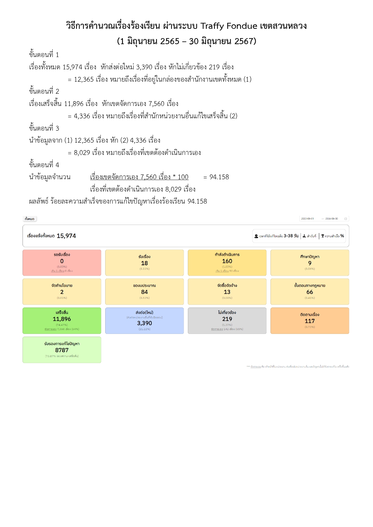 ![]() | 01-07-2024 | 94.16 | ![]() | รับเรื่องร้องเรียน ตั้งแต่วันที่ 1 มิถุนายน 65 - 30 มิถุนายน 67 ขั้นตอนที่ 1 เรื่องทั้งหมด 15,974 เรื่อง หักส่งต่อใหม่ 3,390 เรื่อง หักไม่เกี่ยวข้อง 219 เรื่อง = 12,365 เรื่อง หมายถึงเรื่องที่อยู่ในกล่องของสำนักงานเขตทั้งหมด (1) ขั้นตอนที่ 2 เรื่องเสร็จสิ้น 11,896 เรื่อง หักเขตจัดการเอง 7,560 เรื่อง = 4,336 เรื่อง หมายถึงเรื่องที่สำนักหน่วยงานอื่นแก้ไขเสร็จสิ้น (2) ขั้นตอนที่ 3 นำข้อมูลจาก (1) 12,365 เรื่อง หัก (2) 4,336 เรื่อง = 8,029 เรื่อง หมายถึงเรื่องที่เขตต้องดำเนินการเอง ขั้นตอนที่ 4 นำข้อมูลจำนวน เรื่องเขตจัดการเอง 7,560 เรื่อง * 100 = 94.158 เรื่องที่เขตต้องดำเนินการเอง 8,029 เรื่อง ผลลัพธ์ ร้อยละความสำเร็จของการแก้ไขปัญหาเรื่องร้องเรียน 94.158 | |