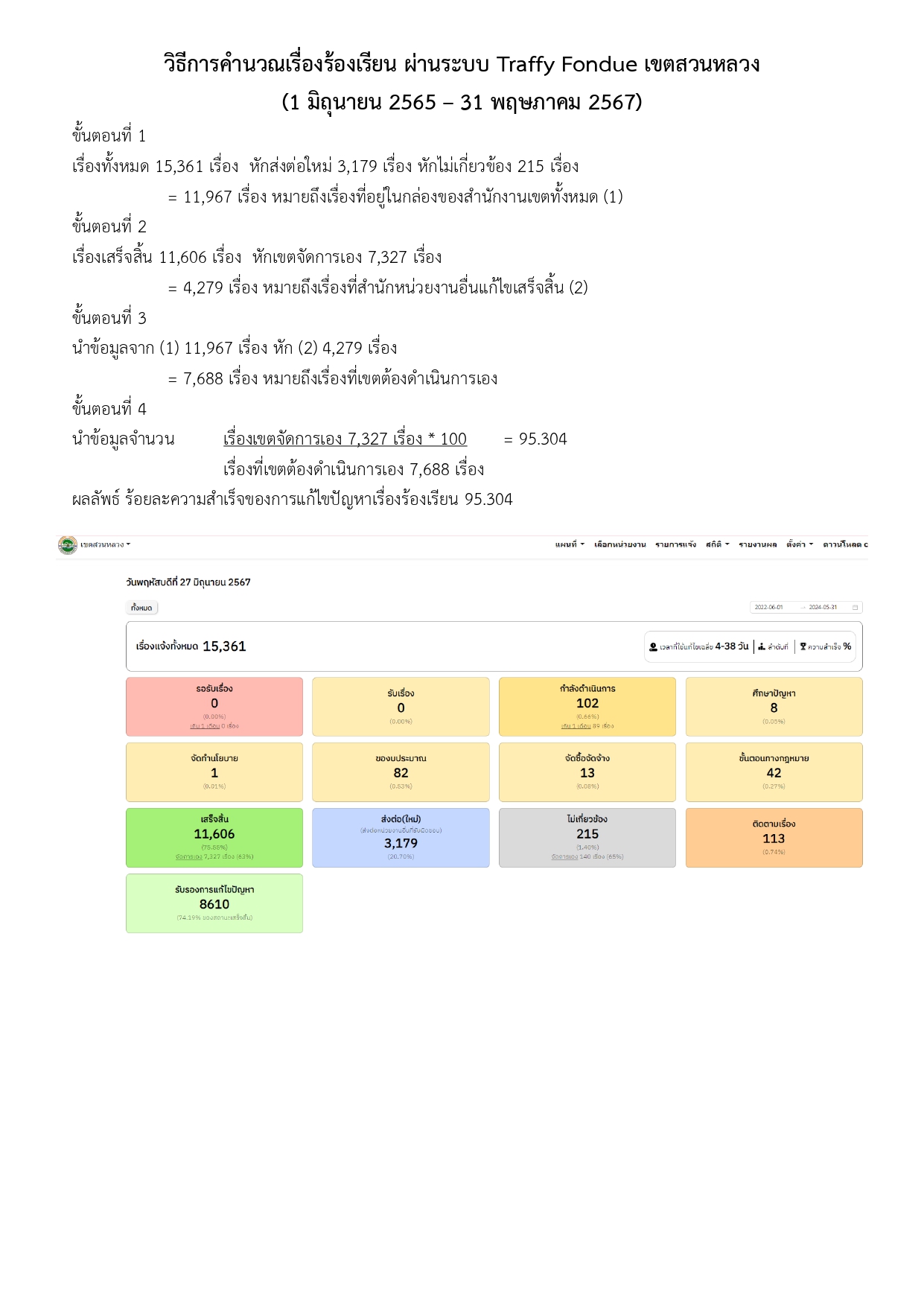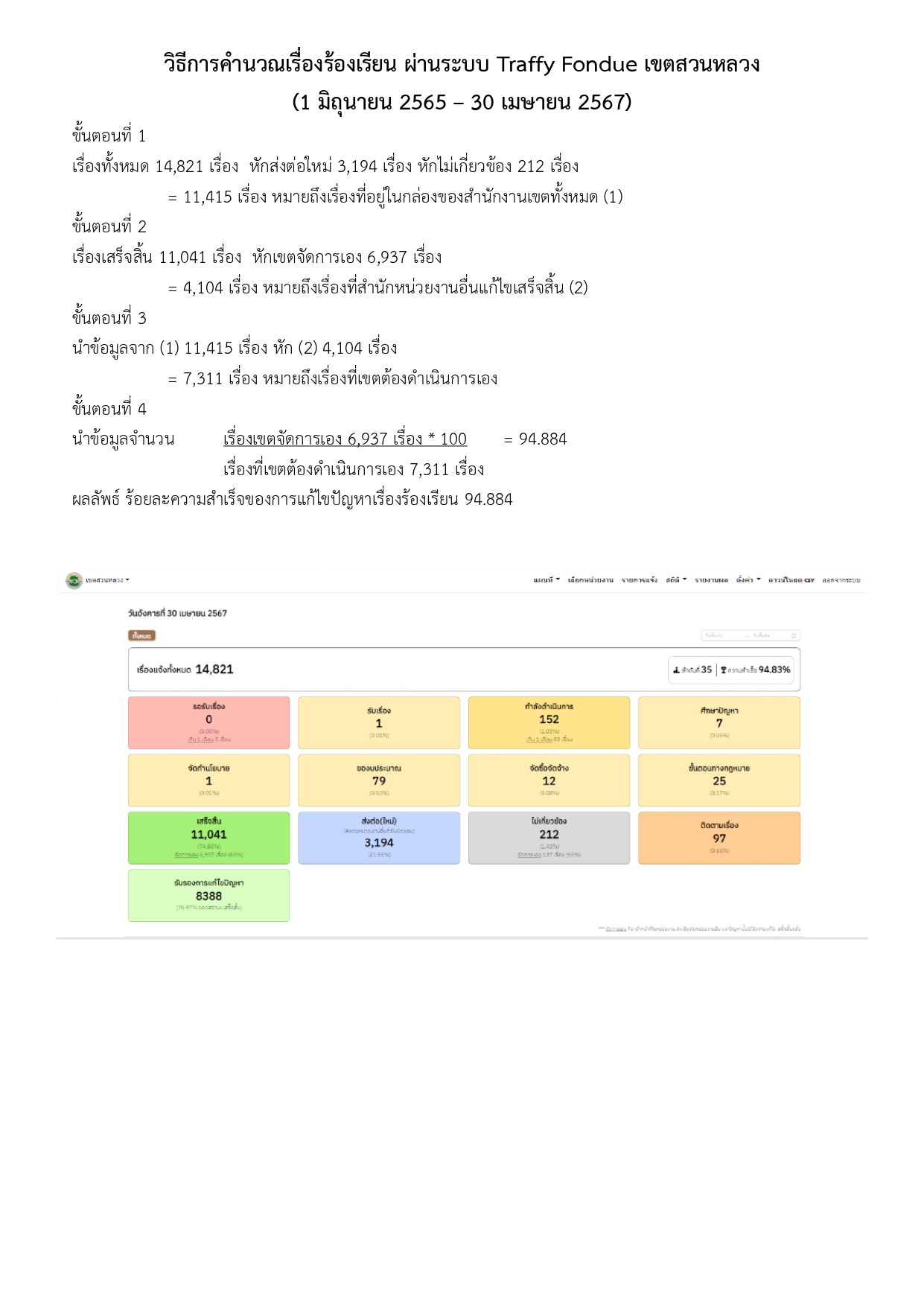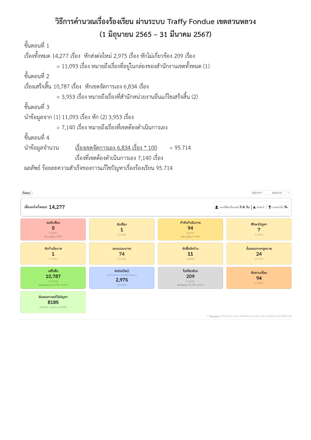 ![]() | 29-04-2024 | 94.88 | ![]() | รับเรื่องร้องเรียน ตั้งแต่วันที่ 1 มิถุนายน 65 - 30 เมษายน 67 ขั้นตอนที่ 1 เรื่องทั้งหมด 14,821 เรื่อง หักส่งต่อใหม่ 3,194 เรื่อง หักไม่เกี่ยวข้อง 212 เรื่อง = 11,415 เรื่อง หมายถึงเรื่องที่อยู่ในกล่องของสำนักงานเขตทั้งหมด (1) ขั้นตอนที่ 2 เรื่องเสร็จสิ้น 11,041 เรื่อง หักเขตจัดการเอง 6,937 เรื่อง = 4,104 เรื่อง หมายถึงเรื่องที่สำนักหน่วยงานอื่นแก้ไขเสร็จสิ้น (2) ขั้นตอนที่ 3 นำข้อมูลจาก (1) 11,415 เรื่อง หัก (2) 4,104 เรื่อง = 7,311 เรื่อง หมายถึงเรื่องที่เขตต้องดำเนินการเอง ขั้นตอนที่ 4 นำข้อมูลจำนวน เรื่องเขตจัดการเอง 6,937 เรื่อง * 100 = 94.884 เรื่องที่เขตต้องดำเนินการเอง 7,311 เรื่อง ผลลัพธ์ ร้อยละความสำเร็จของการแก้ไขปัญหาเรื่องร้องเรียน 94.884 | |