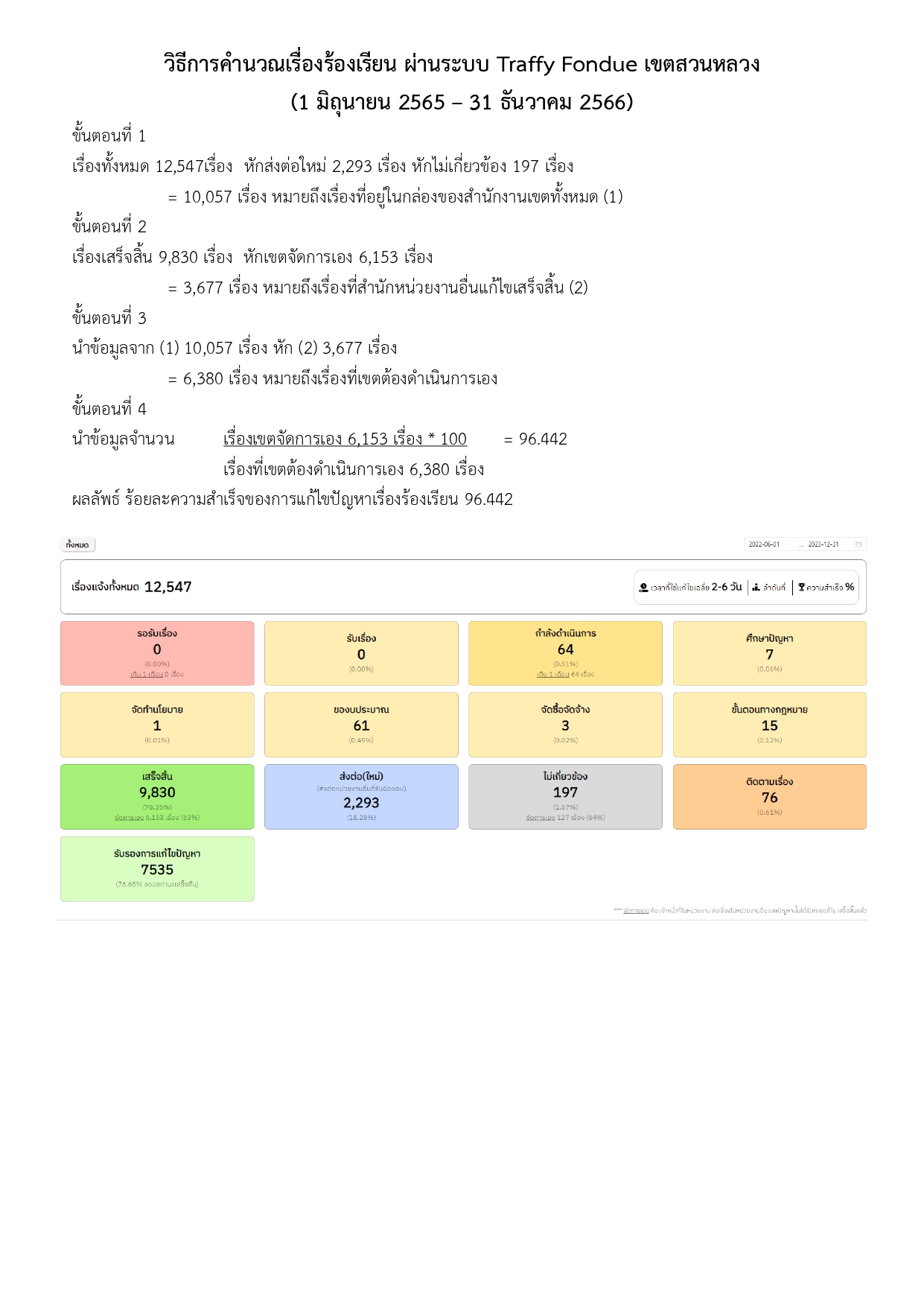![]() | 31-01-2024 | 96.44 | ![]() | รับเรื่องร้องเรียน ตั้งแต่วันที่ 1 มิถุนายน 65 - 31 ธันวาคม 2566 ขั้นตอนที่ 1 เรื่องทั้งหมด 12,547เรื่อง หักส่งต่อใหม่ 2,293 เรื่อง หักไม่เกี่ยวข้อง 197 เรื่อง = 10,057 เรื่อง หมายถึงเรื่องที่อยู่ในกล่องของสำนักงานเขตทั้งหมด (1) ขั้นตอนที่ 2 เรื่องเสร็จสิ้น 9,830 เรื่อง หักเขตจัดการเอง 6,153 เรื่อง = 3,677 เรื่อง หมายถึงเรื่องที่สำนักหน่วยงานอื่นแก้ไขเสร็จสิ้น (2) ขั้นตอนที่ 3 นำข้อมูลจาก (1) 10,057 เรื่อง หัก (2) 3,677 เรื่อง = 6,380 เรื่อง หมายถึงเรื่องที่เขตต้องดำเนินการเอง ขั้นตอนที่ 4 นำข้อมูลจำนวน เรื่องเขตจัดการเอง 6,153 เรื่อง * 100 = 96.442 เรื่องที่เขตต้องดำเนินการเอง 6,380 เรื่อง ผลลัพธ์ ร้อยละความสำเร็จของการแก้ไขปัญหาเรื่องร้องเรียน 96.442 | |