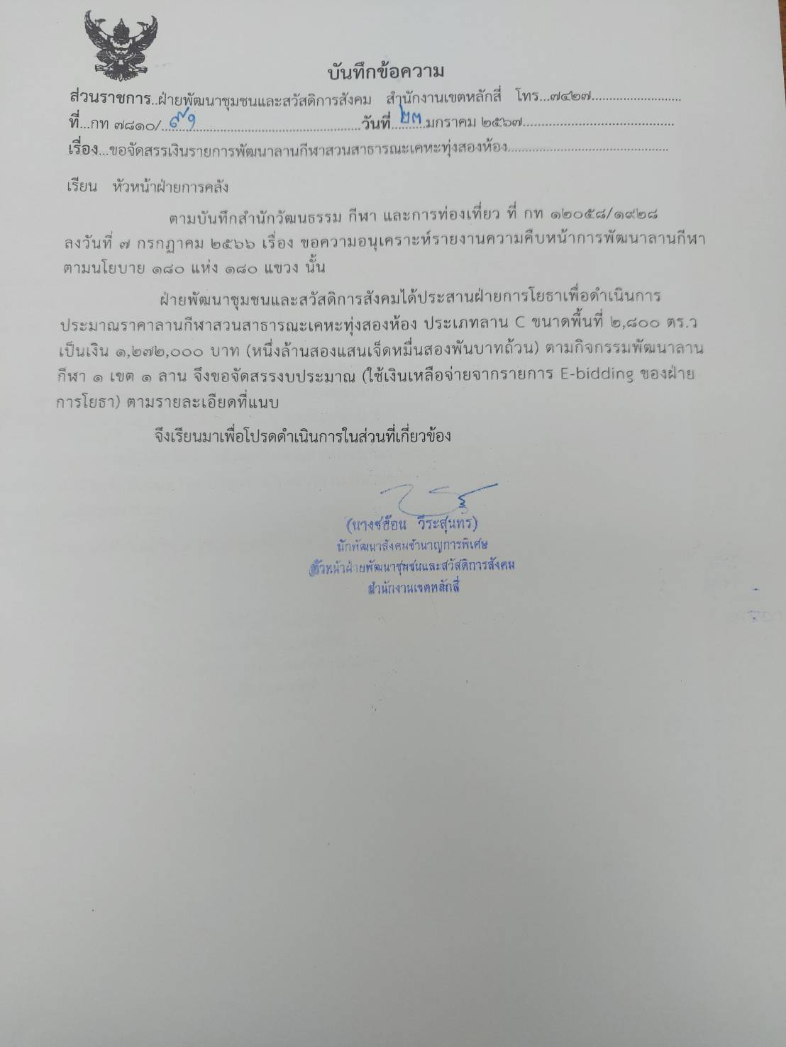 ![]() | 27-02-2024 | 0.00 | ดำเนินการตรวจสอบลานกีฬาที่ต้องการปรับปรุงตามนโยบายผู้ว่าราชการกรุงเทพมหานคร และดำเนินการประสานฝ่ายโยธาเพื่อดำเนินการประมาณราคาเสร็จสิ้นเรียบร้อยแล้ว ประสานฝ่ายการคลังเพื่อขอจัดสรรเงินรายการพัฒนาลานกีฬาสวนสาธารณะเคหะทุ่งสองห้อง เป็นเงิน 1,272,000 บาท | ||