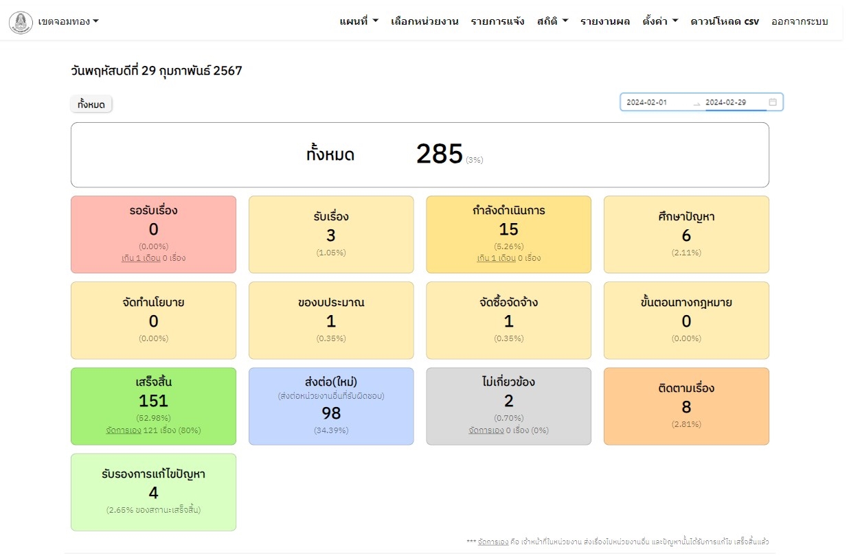 ![]() | - | เพิ่มประสิทธิภาพการบริหารจัดการเรื่องร้องเรียนผ่าน Traffy Fondue สำนักงานเขตจอมทอง | 0.00 | 100.00 | สำนักงานเขตจอมทอง | ฝ่ายปกครอง |