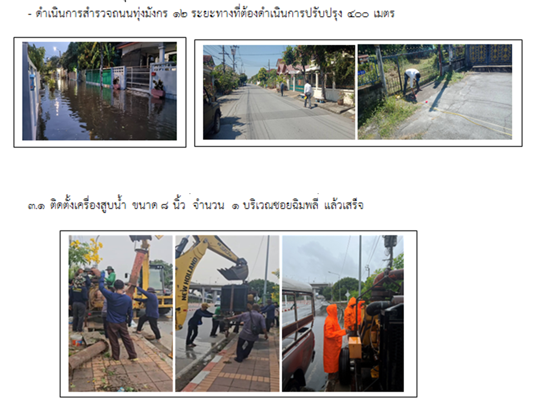 22-08-20241.00ดำเนินการแก้ไขจุดเสี่ยงเรียบร้อย ติดตั้งเครื่องสูบน้ำ ขนาด 8 นิ้ว จำนวน 1 บริเวณซอยฉิมพลี แล้วเสร็จ ก่อสร้างรางระบายน้ำ บริเวณซอยทุ่งมังกร 12 แล้วเสร็จ การสำรวจความพึงพอใจของประชาชน สำรวจความพึงพอใจของประชาชน จำนวน 136 คน คนสรุปผลความพึงพอใจ คิดเป็นร้อยละ ๘๑.๒ ข้อเสนอแนะที่ได้รับจากประชาชน - ต้องการให้แก้ไขจุดน้ำท่วมเวลาฝนตกเพื่อลดปัญหาน้ำท่วมทำให้การสัญจรไม่ได้รับความสะดวก ปัญหา อุปสรรคและวิธีการแก้ไขในการดำเนินงานที่ผ่านมา - ท่อระบายน้ำเดิมมีขนาดเล็กทำให้การระบายน้ำมีความล่าช้า เกิดปัญหาน้ำท่วมขังผิวจราจร การแก้ไขปัญหาโดยการวางท่อระบายน้ำขนาดใหญ่ เพื่อลดปัญหาน้ำท่วม เพิ่มประสิทธิ์การระบายน้ำ เพิ่มพื้นที่รองรับน้ำ - มีเศษขยะ และสิ่งของของประชาชนบางส่วนตั้งวางขวางทางน้ำ โดยได้ดำเนินการจัดเก็บขยะ และจัดเจ้าหน้าที่ตรวจตราในช่วงเวลาฝนตก ข้อเสนอแนะในการดำเนินงานในปีงบประมาณต่อไป ตรวจสอบดูแลและลอกท่อระบายน้ำ