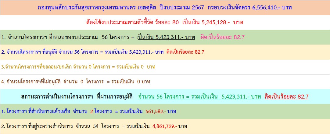 2 | จัดทำแผนปฏิบัติการส่งเสริมการใช้เงินกองทุนหลักประกันสุขภาพกรุงเทพมหานคร สำนักงานเขตดุสิต ประจำปีงบประมาณ พ.ศ.2567 | 5.00 | 01-11-2023 | 31-12-2023 |