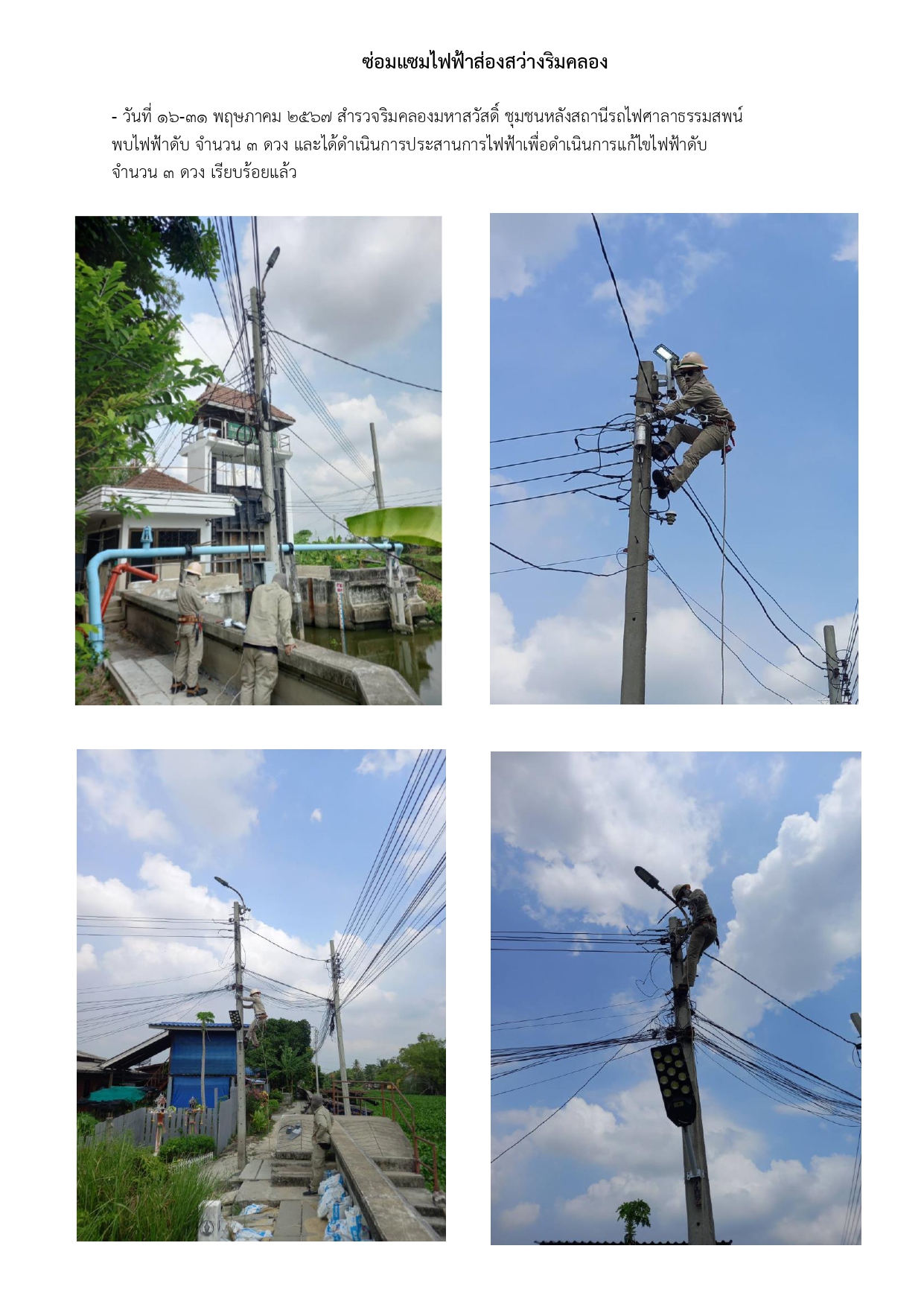 3 | ดำเนินการสำรวจ ตรวจสอบความพร้อมใช้งาน และติดตั้ง/ซ่อม ไฟฟ้าส่องสว่างริมคลองที่มีการชำรุด เดือน พ.ย. 2566 | 8.00 | 01-11-2023 | 30-11-2023 |
