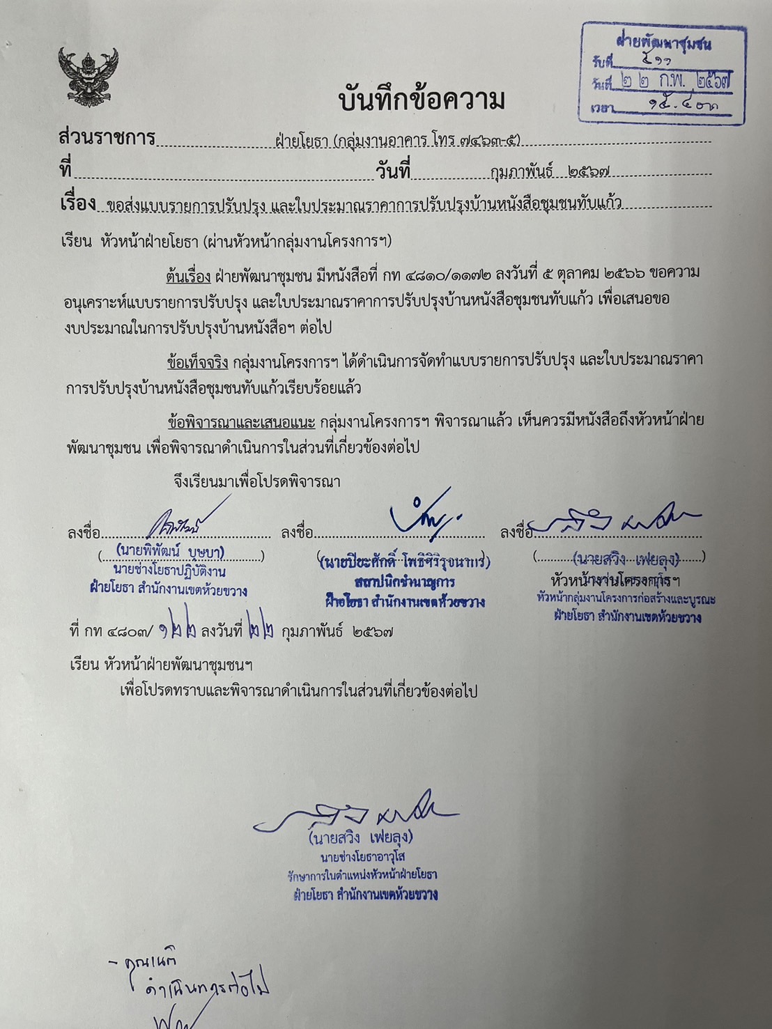 20-02-20240.00ประเมินค่าใช้จ่ายจากฝ่ายโยธาเรียบร้อยแล้ว