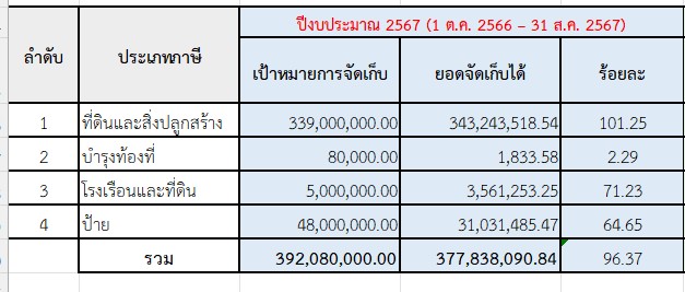 4.1 | สำรวจ/ตรวจสอบฐานข้อมูลการจัดเก็บภาษีที่ดินเเละสิ่งปลูกสร้างที่มีอยู่เดิม | 5.00 | 01-10-2023 | 31-01-2024 |