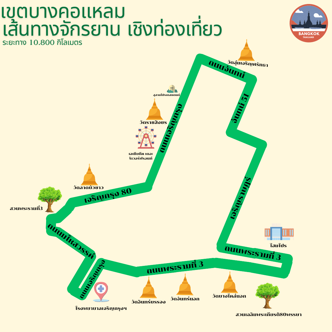 18-04-20240.00สำนักงานเขตบางคอแหลมกำหนดเส้นทางจักรยาน โดยเริ่มจากสวนเฉลิมพระเกียรติ6รอบ พระชนมพรรษา-วัดบางโคล่นอก-วัดจันทร์นอก-วัดอินทร์บรรจง-ถนนเจริญกรุง-โรงพยาบาลเจริญกรุง-ถนนมไหสวรรย์-สวนพระราม3-เจริญกรุง80-วัดลาดบัวขาว-ถนนเจริญกรุงวัดราชสิงขร-ถนนจันทน์-วัดลุ่มเจริญศรัทธา-จันทน์51-ถนนเจริญราษฎร์-ถนนพระรามที่3-โฮมโปร-สิ้นสุดที่สวนเฉลิมพระเกียรติ6รอบ พระชนมพรรษา โดยมีรายละเอียดตามรูปที่แนบ
