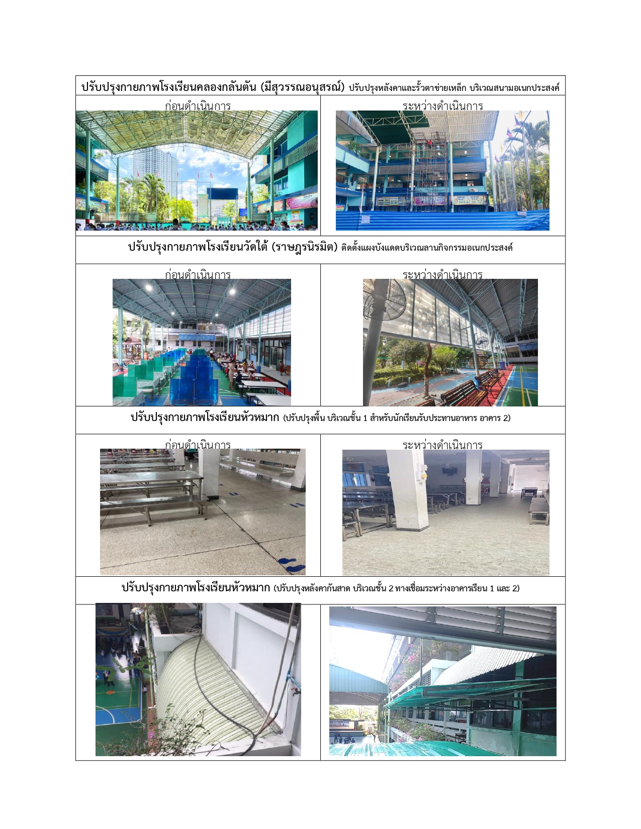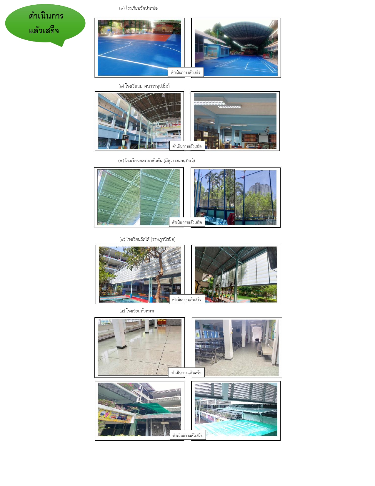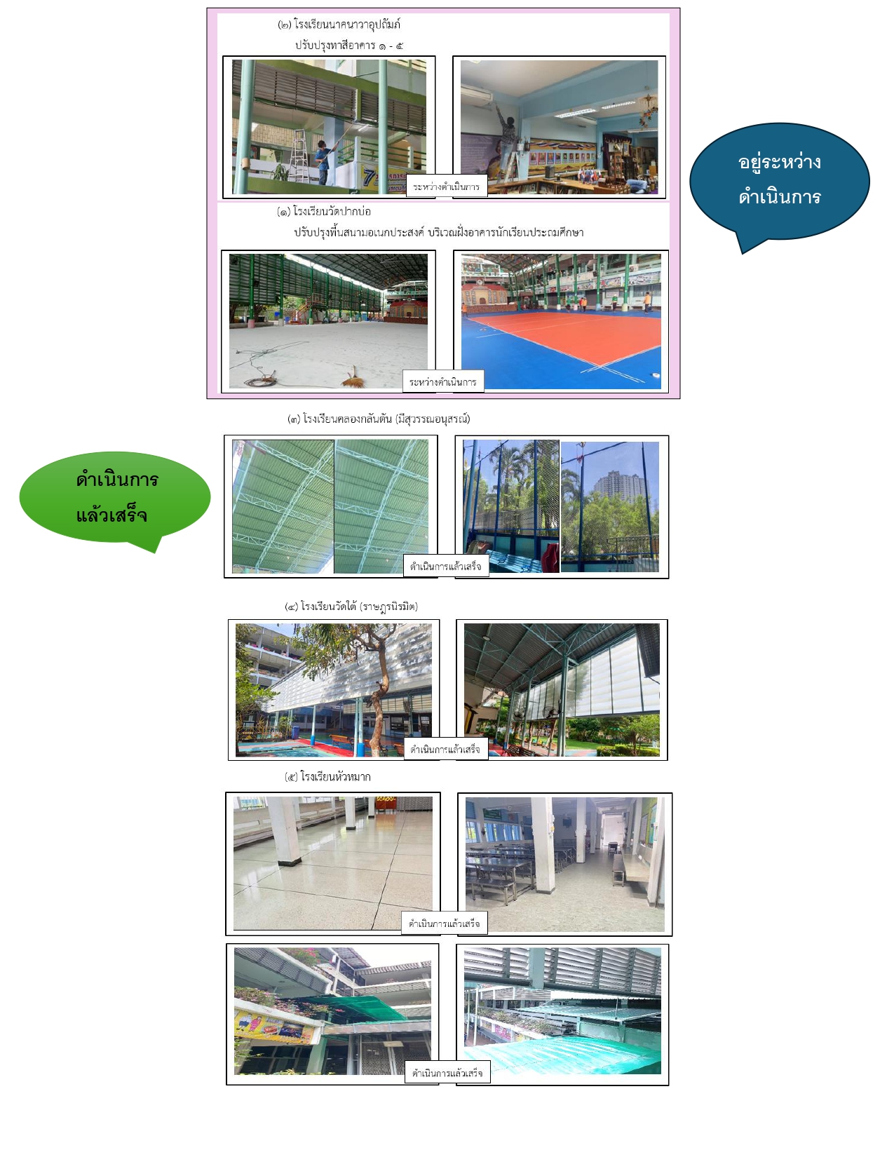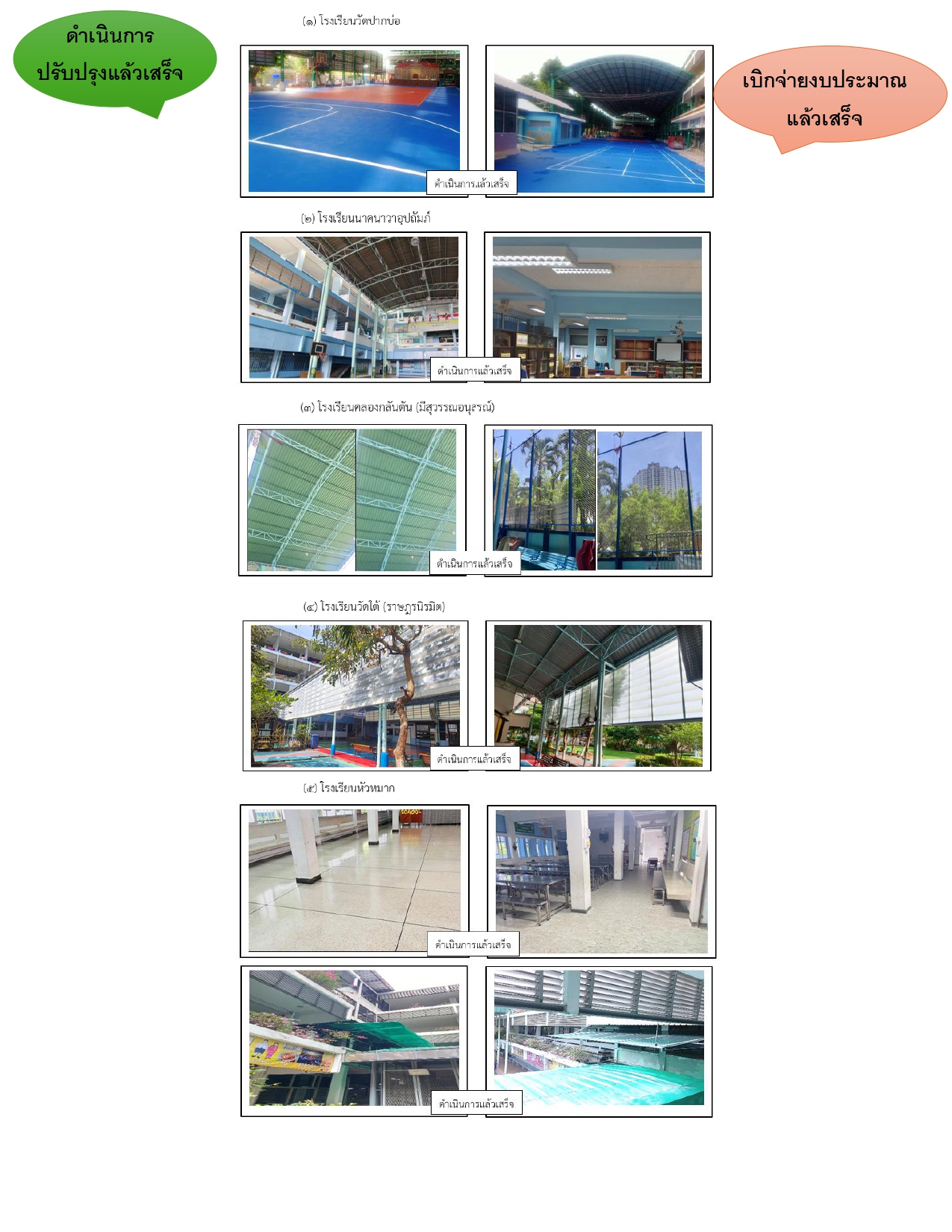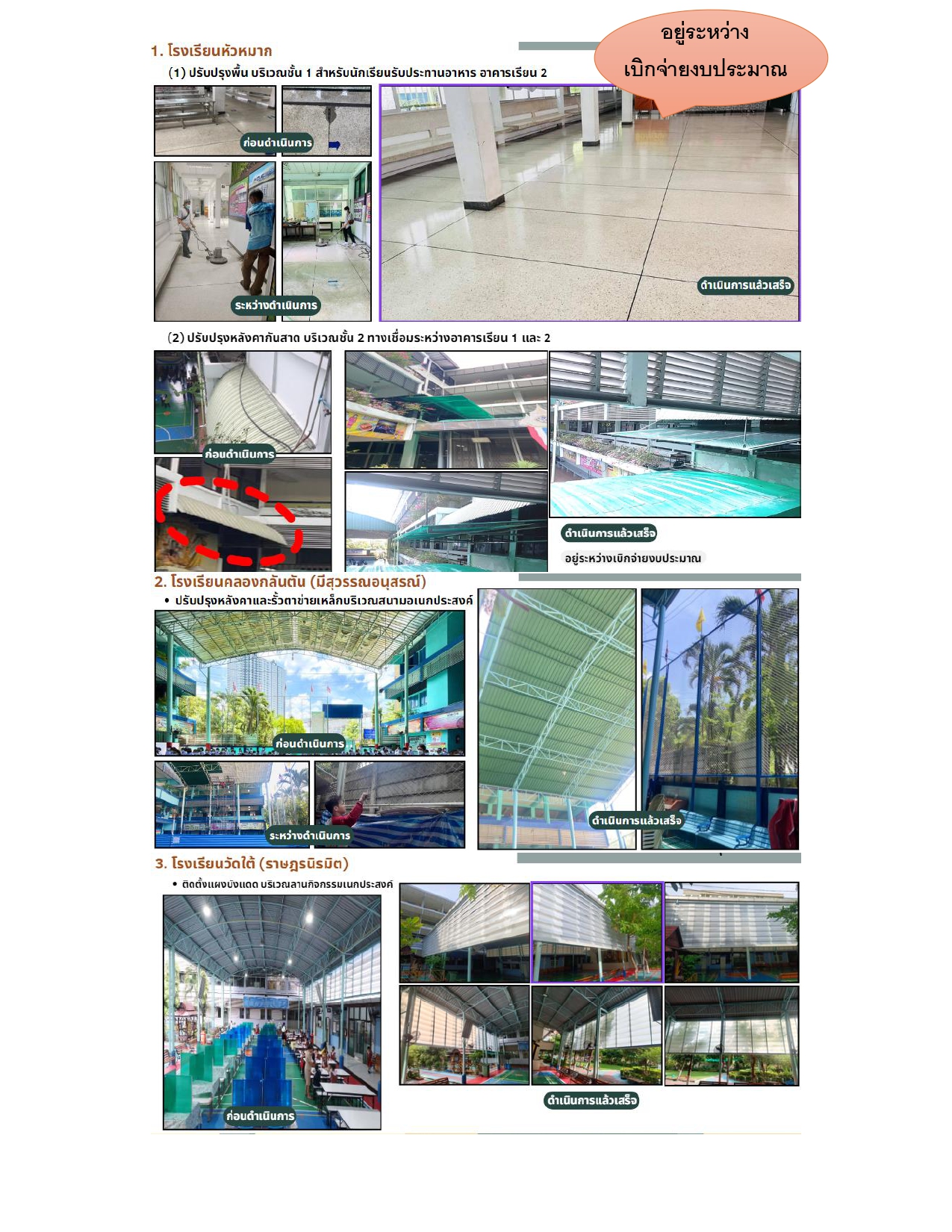 ![]() | 31-07-2024 | 0.00 | ![]() | ดำเนินการปรับปรุงกายภาพโรงเรียนแล้วเสร็จ ดังนี้ 1. โรงเรียนคลองกลันตัน (มีสุวรรณอนุสรณ์) ปรับปรุงหลังคาและรั้วตาข่ายเหล็ก บริเวณสนามอเนกประสงค์ 2. โรงเรียนวัดใต้ (ราษฎรนิรมิต) ติดตั้งแผงบังแดด บริเวณลานกิจกรรมอเนกประสงค์ 3. โรงเรียนหัวหมาก ปรับปรุง (1) ปรับปรุงพื้น บริเวณชั้น 1 สำหรับนักเรียนรับประทานอาหาร อาคาร 2 (2) ปรับปรุงหลังคากันสาด บริเวณชั้น 2 ทางเชื่อมระหว่างอาคารเรียน 1 และ 2 4. โรงเรียนนาคนาวาอุปถัมภ์ ปรับปรุงทาสีอาคาร 1 - 5 5. โรงเรียนวัดปากบ่อ ปรับปรุงพื้นสนามอเนกประสงค์ บริเวณฝั่งอาคารนักเรียนประถมศึกษา | |