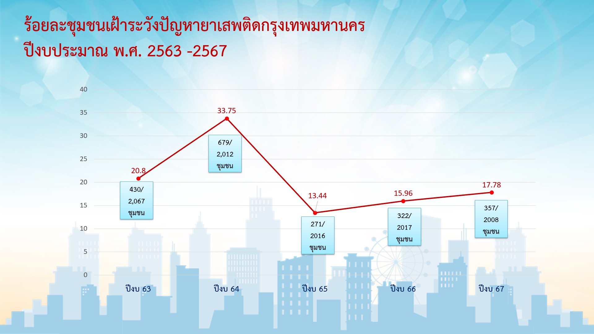 ![]() | 17-09-2024 | 10.01 | ชุมชนที่จัดตั้งตามระเบียบฯ มีทั้งหมด 2,008 ชุมชน ชุมชนที่จัดตั้งมีความเสี่ยงและเฝ้าระวังปัญหายาเสพติด มีทั้งหมด 357 ชุมชน ได้แก่ กลุ่มที่ 1 ชุมชนเข้มแข็งและบำบัดยั่งยืน เฝ้าระวัง 86 ชุมชน 1.1 โครงการฯ ชุมชนบำบัด (1 สน. 1 ชุมชม) โดย บช.น. อยู่ในโครงการฯ 75 ชุมชน (เฝ้าระวัง 19) ดำเนินการ ครบ 75 ชุมชน 1.2 โครงการฯ ชุมชนเข้มแข็ง โดยกทม. อยู่ในโครงการฯ 88 ชุมชน (เฝ้าระวัง 73 ชุมชน) ดำเนินการ ครบ 88 ชุมชน {หมายเหตุ โครงการ 1.1 กับ 1.2 มีชุมชนซ้ำกัน 6 ชุมชน } กลุ่มที่ 2 CBTx กองทุนแม่ของแผ่น โดยปปส.กทม. เฝ้าระวัง 271 ชุมชน ดำเนินการ 266 ชุมชน (98.15%) กลุ่มที่ 3 ชุมชนทั่วไป 1,582 ชุมชน (ไม่ใช่ชุมชนเฝ้าระวังแต่มีการดำเนินงานกิจกรรม) ดำเนินการ 1,566 ชุมชน (98.99%) ผลการดำเนินกิจกรรมการขับเคลื่อนการป้องกันและแก้ไขปัญหายาเสพติดในชุมชนกรุงเทพมหานคร ชุมชนที่จัดตั้งมีความเสี่ยงและเฝ้าระวังปัญหายาเสพติด จำนวน 201 ชุมชน คิดเป็นร้อยละ 10.01 (ข้อมูลตั้งแต่ เดือนมีนาคม - 15 กัยายน 2567) | ||