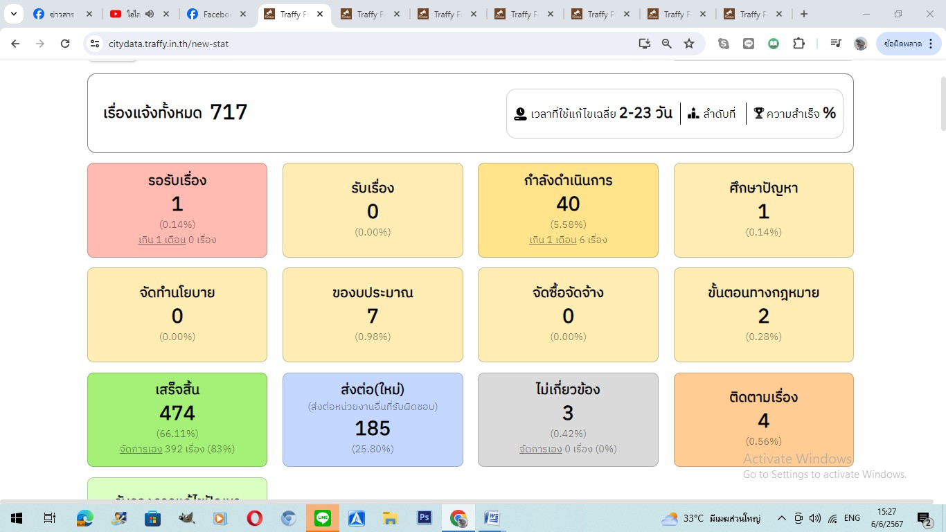 ![]() | 31-05-2024 | 91.00 | ![]() | ผลการดำเนินการแก้ไขเรื่องร้องเรียนจากประชาชนผ่าน ทราฟฟี่ ฟองดูร์ ประจำเดือนพฤษภาคม 2567 เรื่องทั้งหมด 717 เรื่อง / รอรับเรื่อง 1 เรื่อง / กำลังดำเนินการ 40 เรื่อง / ส่งต่อ 185 เรื่อง / เสร็จสิ้น 474 เรื่อง | |