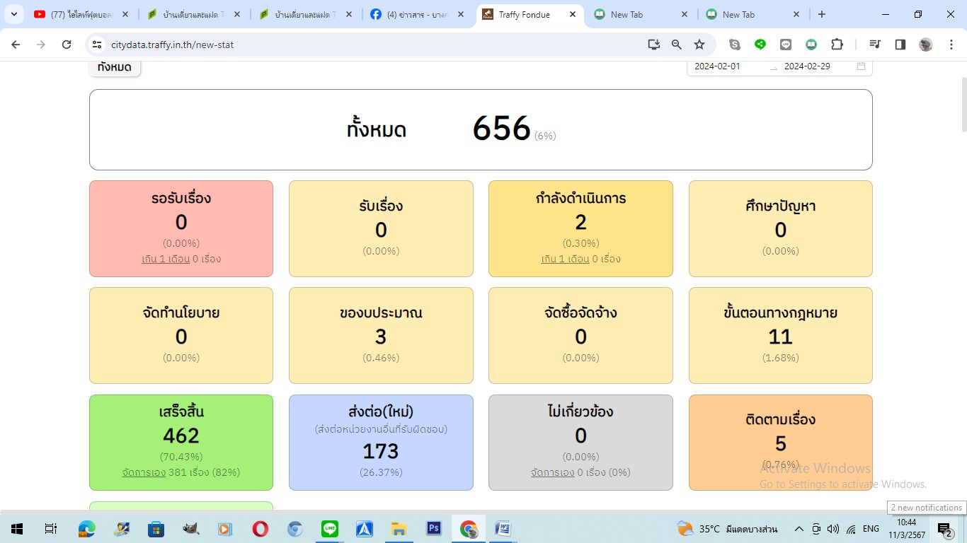 ![]() | 31-01-2024 | 87.73 | ผลการดำเนินการแก้ไขเรื่องร้องเรียนจากประชาชนผ่าน ทราฟฟี่ ฟองดูร์ ประจำเดือนมกราคม 2567 เรื่องทั้งหมด 898 เรื่อง / รอรับเรื่อง 0 เรื่อง / กำลังดำเนินการ 19 เรื่อง / ส่งต่อ 319 เรื่อง / เสร็จสิ้น 508 เรื่อง | ||