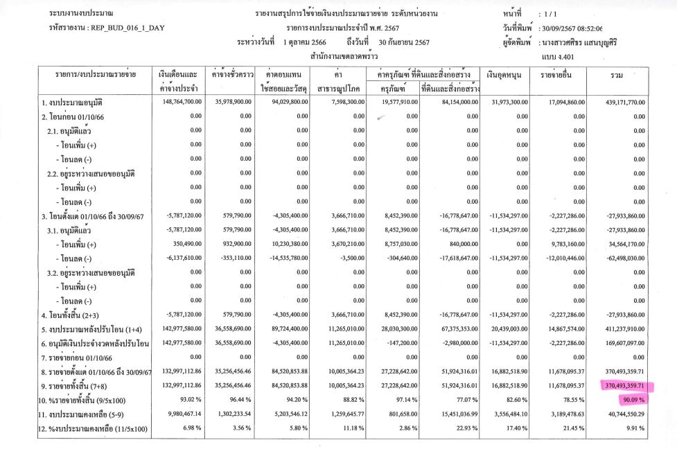 | 30-09-2024 | 18.05 |  | การเบิกจ่ายงบประมาณ ตั้งแต่วันที่ 1 ตุลาคม 2566-30 กันยายน 2567 เป็นเงิน 370,493,359.71 บาท คิดเป็น 90.09% | |