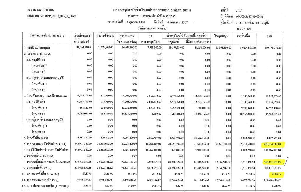 | 04-09-2024 | 44.48 |  | การเบิกจ่ายงบประมาณ ตั้งแต่วันที่ 1 ตุลาคม 2566-4 กันยายน 2567 เป็นเงิน 308,331,580.03 บาท คิดเป็น 72.04% | |