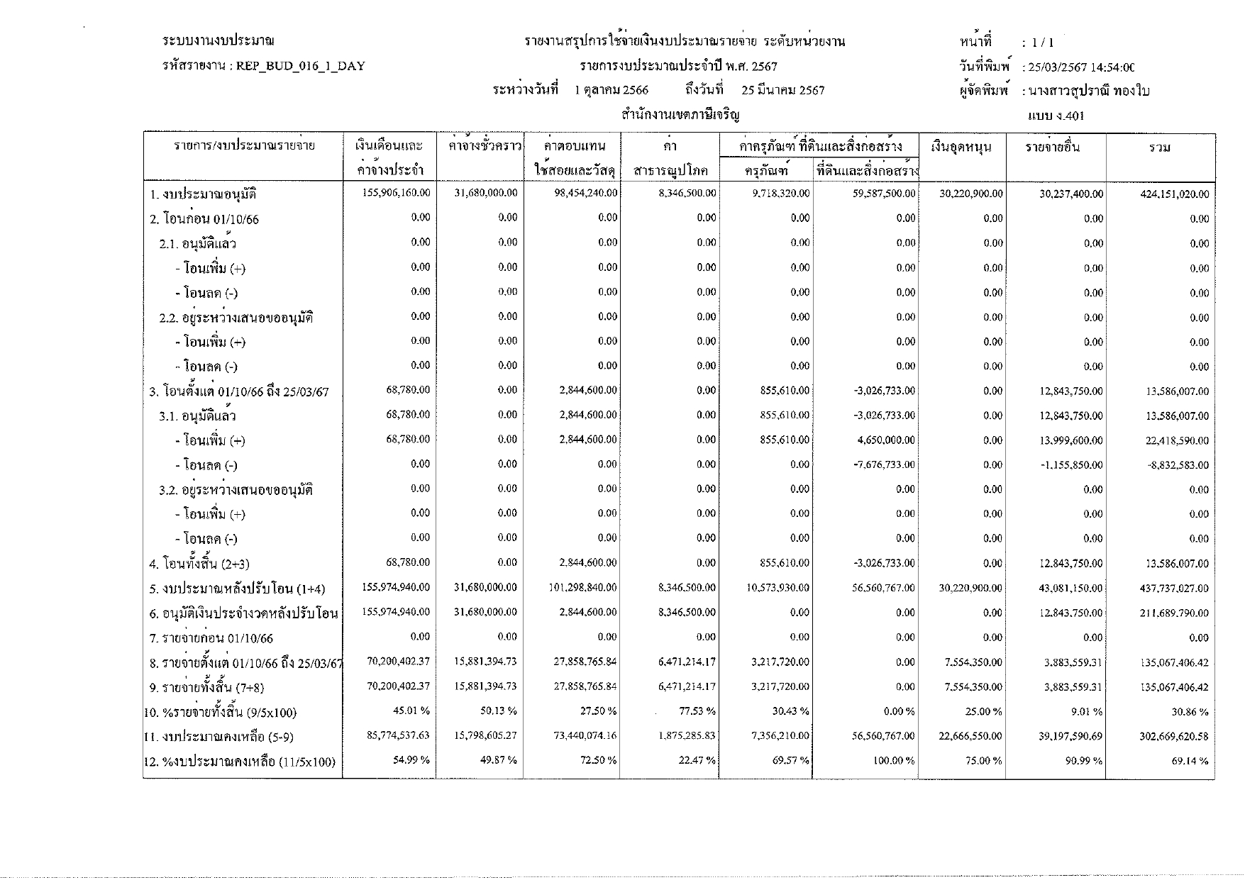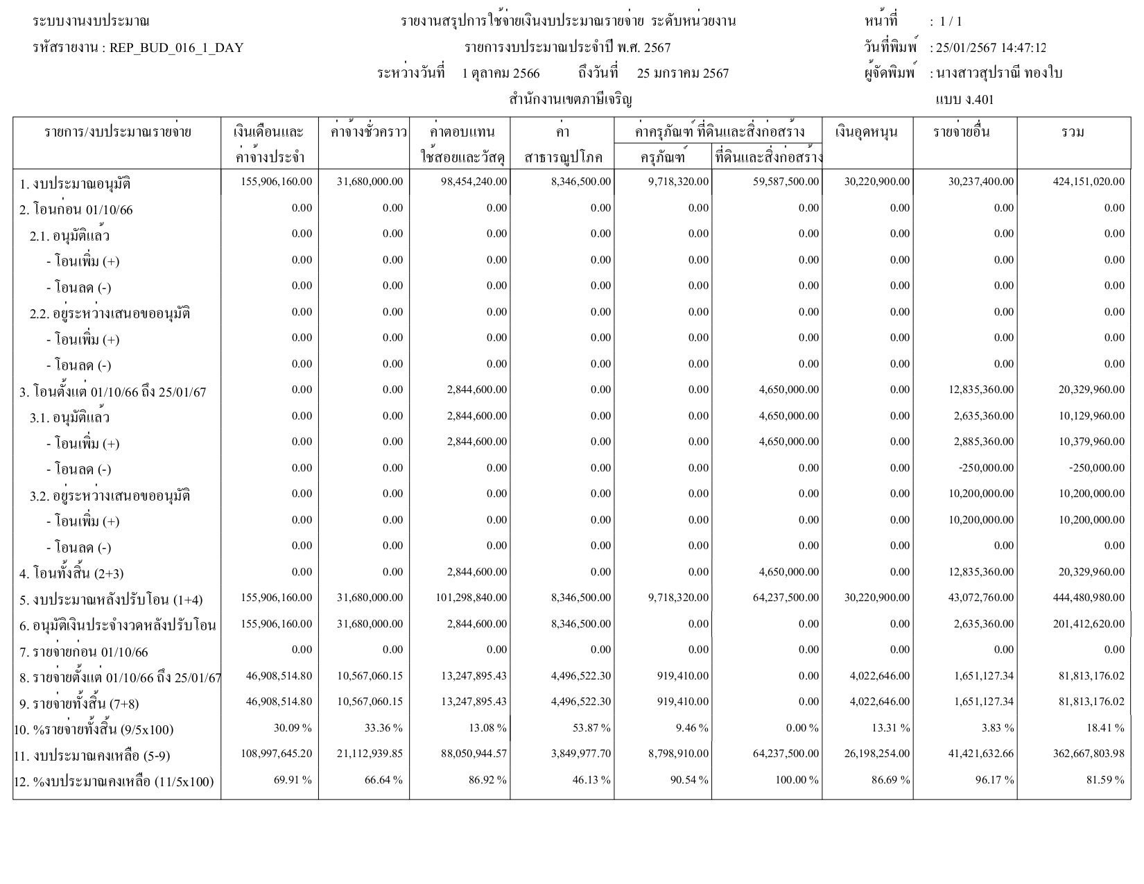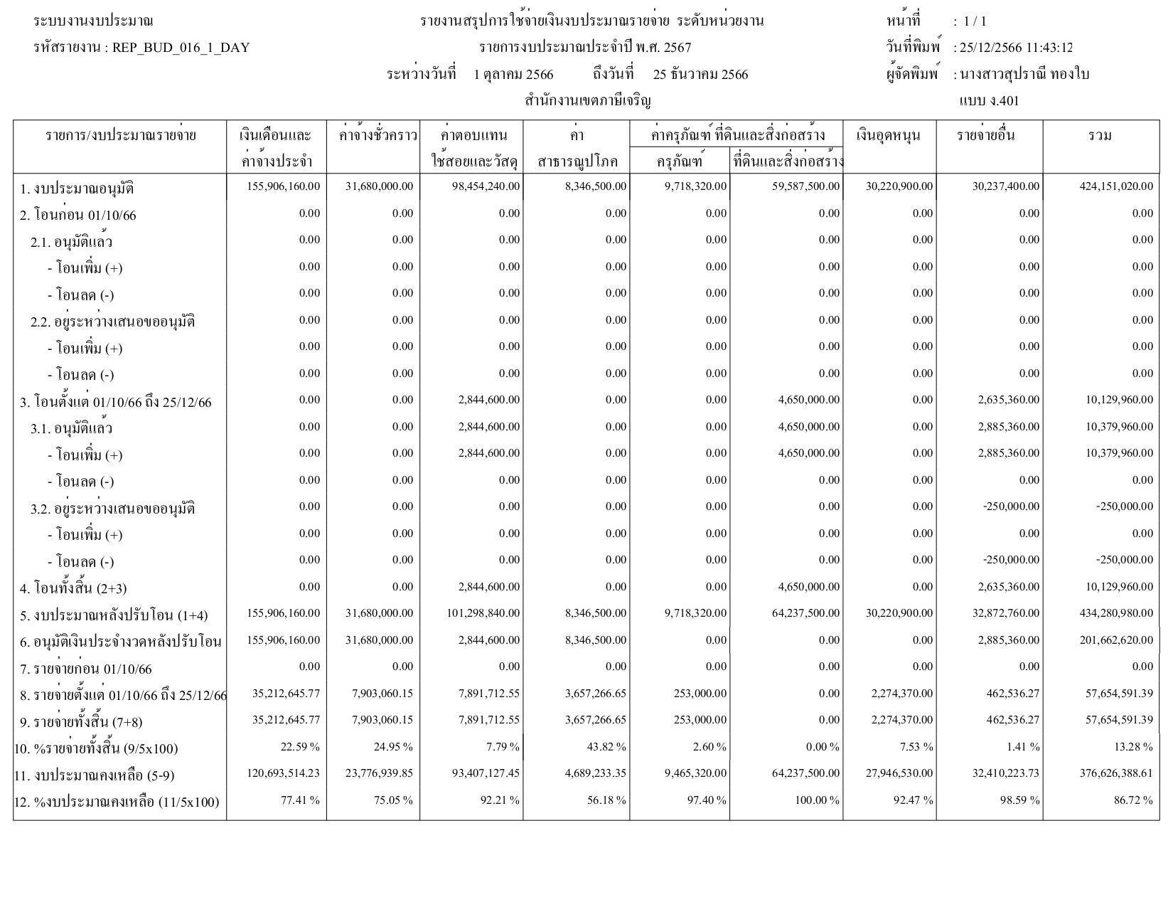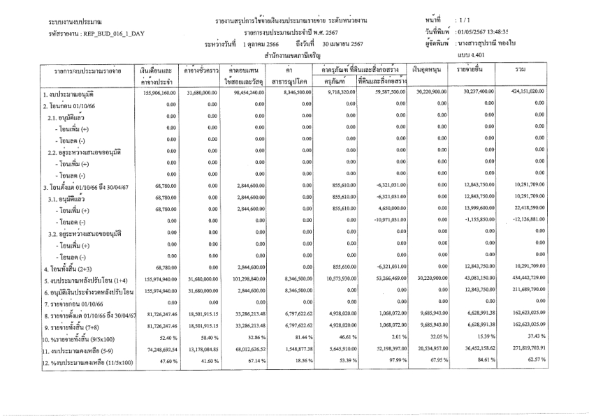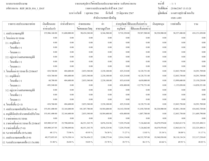 24-09-202490.44ผลการเบิกจ่ายงบประมาณในภาพรวมของสำนักงานเขตภาษีเจริญ ณ วันที่ 24 กันยายน 2567 ได้ร้อยละ 90.44