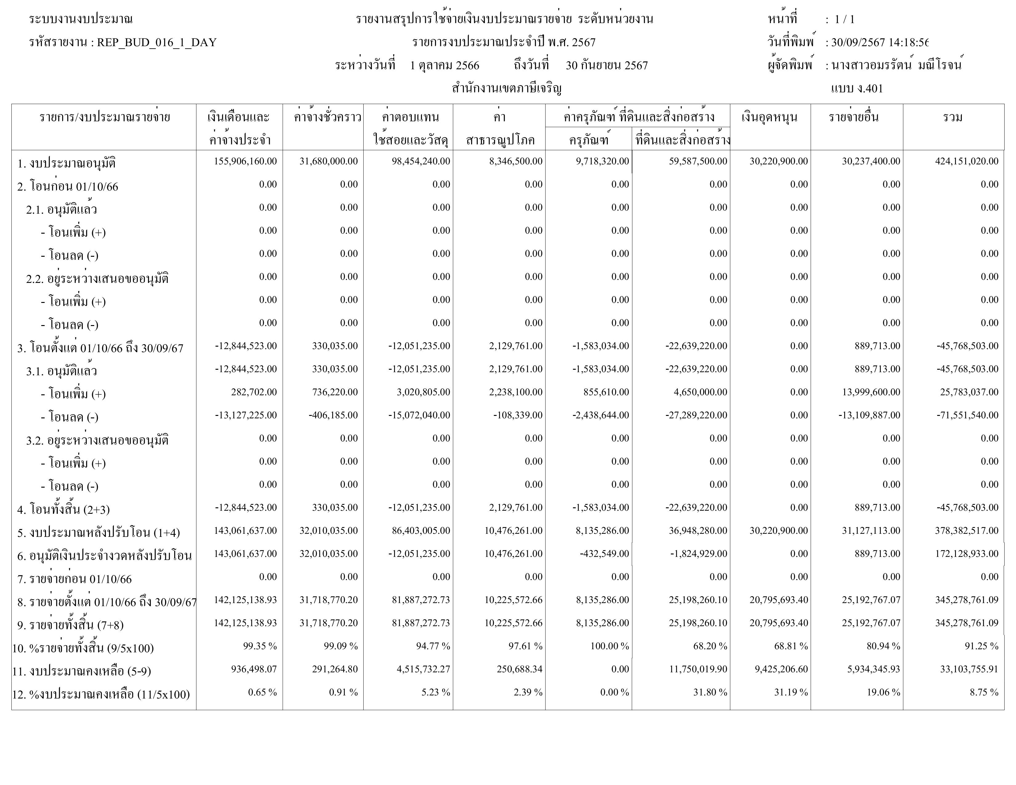 30-09-202491.25ผลการเบิกจ่ายงบประมาณในภาพรวมของสำนักงานเขตภาษีเจริญ ณ วันที่ 30กันยายน 2567 ได้ร้อยละ 91.25