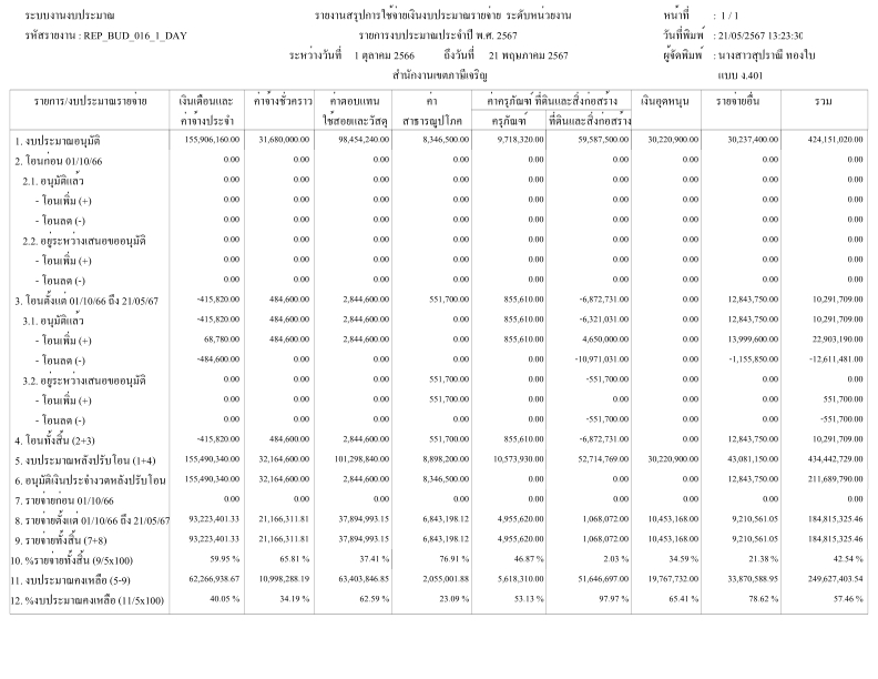 21-05-202442.54ผลการเบิกจ่ายงบประมาณในภาพรวมของสำนักงานเขตภาษีเจริญ ณ วันที่ 21 พฤษภาคม 2567 ได้ร้อยละ 42.54
