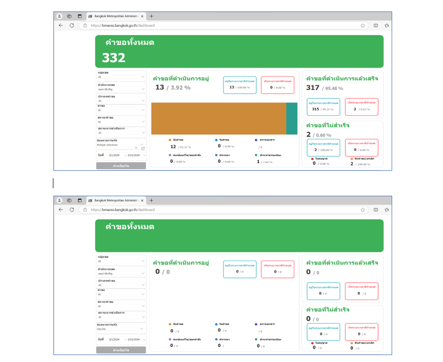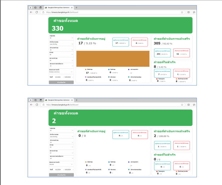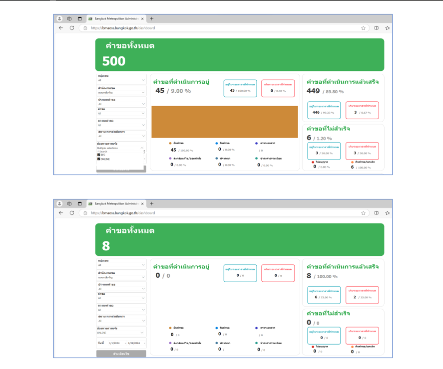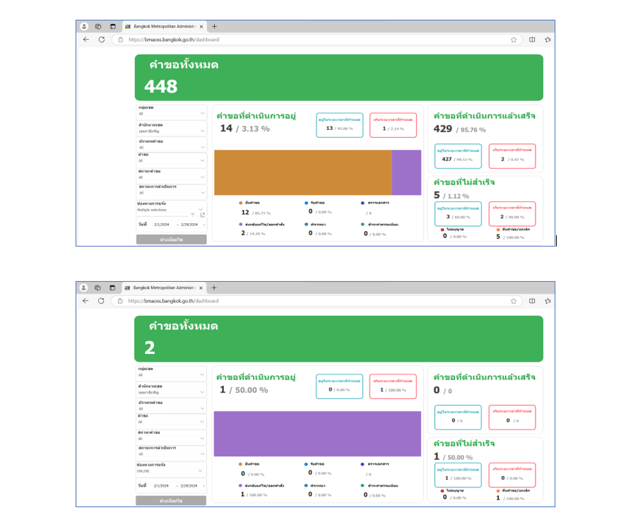 ![]() | 30-04-2024 | 1.60 | ![]() | ม.ค. 67 คำขอทั้งหมด 500 เรื่อง ผ่านช่องทาง BMA OSS 8 เรื่อง คิดเป็นร้อยละ 1.6 | |