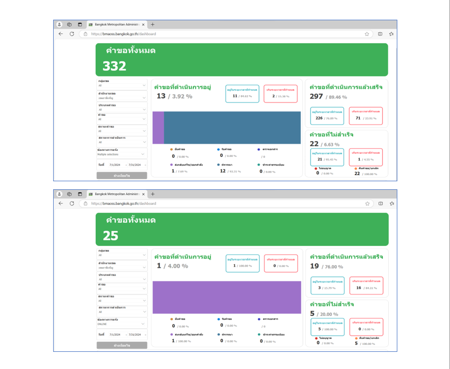 ![]() | 30-09-2024 | 7.53 | ![]() | ก.ค. 67 คำขอทั้งหมด 332 เรื่อง ผ่านช่องทาง BMA OSS 25 เรื่อง คิดเป็นร้อยละ 7.53 | |