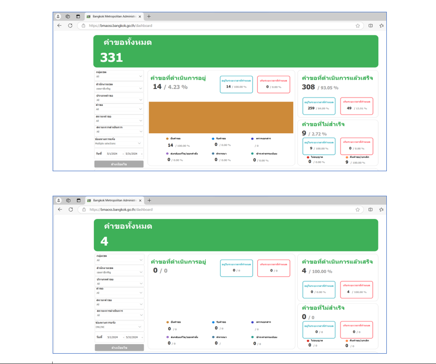 ![]() | 30-09-2024 | 1.21 | ![]() | พ.ค. 67 คำขอทั้งหมด 331 เรื่อง ผ่านช่องทาง BMA OSS 4 เรื่อง คิดเป็นร้อยละ 1.21 | |