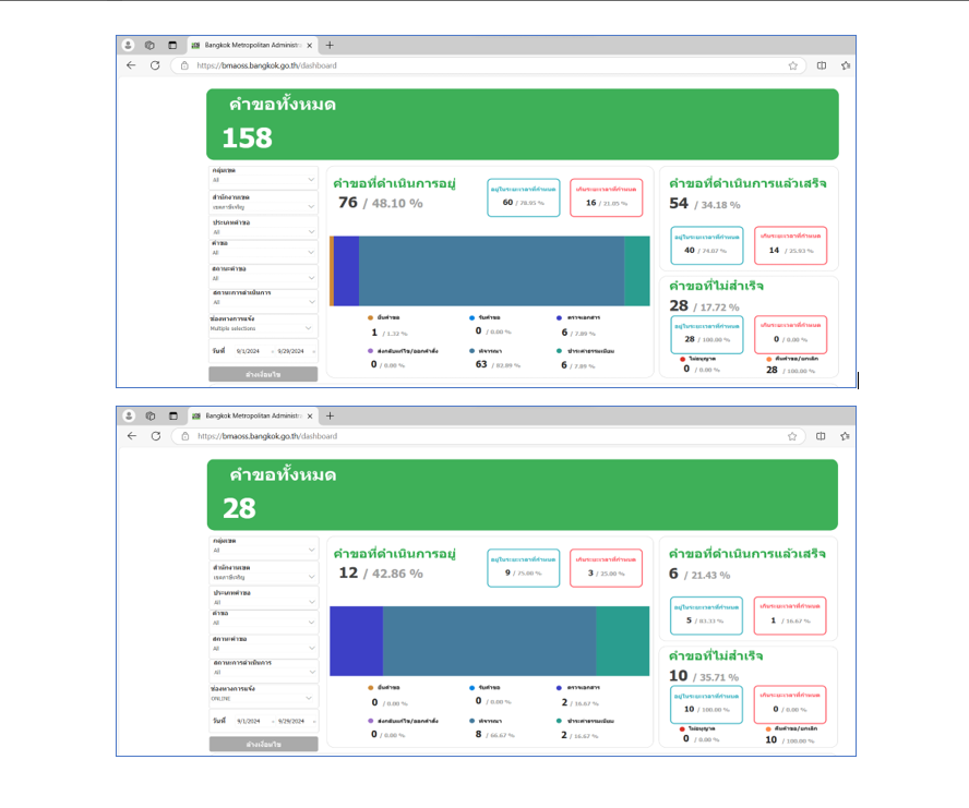 ![]() | 30-09-2024 | 17.72 | ![]() | ก.ย. 67 คำขอทั้งหมด 158 เรื่อง ผ่านช่องทาง BMA OSS 28 เรื่อง คิดเป็นร้อยละ 17.72 | |
