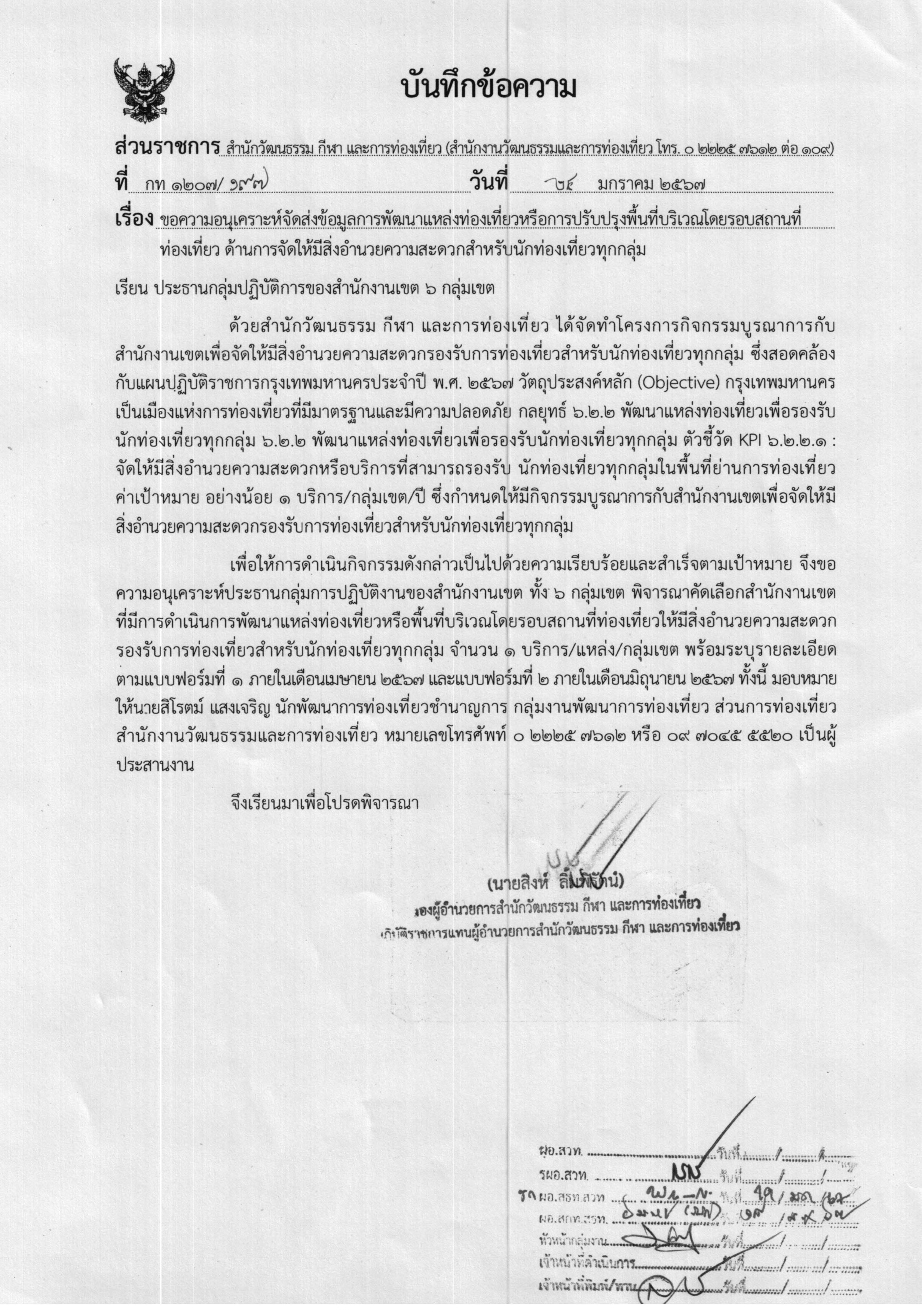 7 | ดำเนินการจัดทำกิจกรรมในการจัดสิ่งอำนวยความสะดวกหรือบริการในแหล่งท่องเที่ยว | 30.00 | 01-03-2024 | 31-08-2024 |
