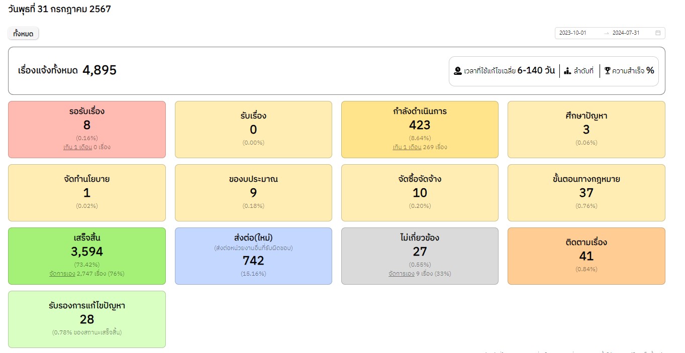 ![]() | 30-08-2024 | 73.00 | ![]() | ผลการดำเนินการแก้ไขเรื่องเรียนผ่านระบบ Traffy Fondue ระหว่างวันที่ 1 ต.ค. 66 - 31 ก.ค. 67 มีรายละเอียดดังนี้ รอรับเรื่อง 8 (0.16%) / รับเรื่อง 0 (0%) / กำลังดำเนินการ 423 (8.64%) / ศึกษาปัญหา 3 (0.06%) / จัดทำนโยบาย 1 (0.02%) / ของบประมาณ 9 (0.18%) / จัดซื้อจัดจ้าง 10 (0.20%) / ขั้นตอนทางกฎหมาย 37 (0.76%) / เสร็จสิ้น 3,594 (73.42%) - จัดการเอง 2,747 (76%) / ส่งต่อใหม่ 742 (15.16%) / ไม่เกี่ยวข้อง 27 (0.55%) / ติดตามเรื่อง 41 (0.84%) / รับรองการแก้ไขปัญหา 28 (0.78%) | |