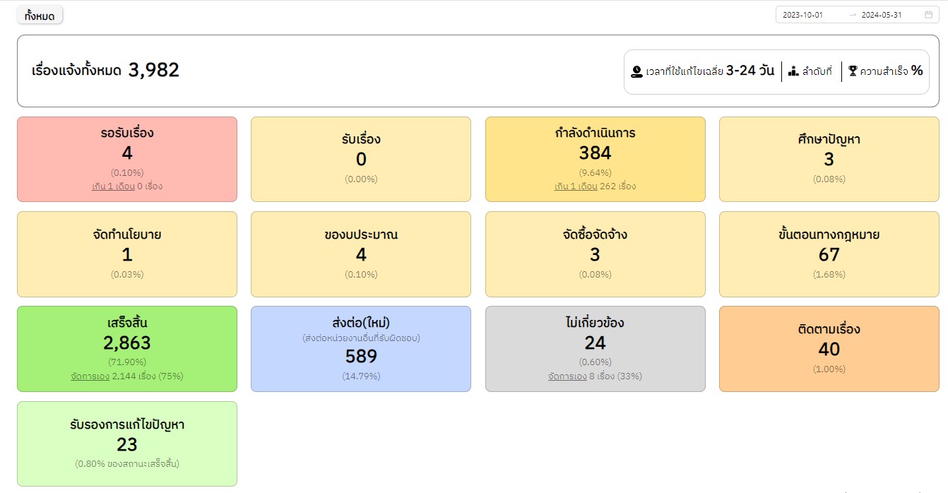 ![]() | 31-05-2024 | 75.00 | ![]() | ผลการดำเนินการแก้ไขเรื่องเรียนผ่านระบบ Traffy Fondue ระหว่างวันที่ 1 ต.ค. 66 - 31 พ.ค. 67 มีรายละเอียดดังนี้ รอรับเรื่อง 4 (0.10%) / รับเรื่อง 0 (0%) / กำลังดำเนินการ 384 (9.64%) / ศึกษาปัญหา 3 (0.08%) / จัดทำนโยบาย 1 (0.03%) / ของบประมาณ 4 (0.10%) จัดซื้อจัดจ้าง 3 (0.08%) / ขั้นตอนทางกฎหมาย 67 (1.68%) / เสร็จสิ้น 2,863 (71.90%) - จัดการเอง 2,144 (75%) / ส่งต่อใหม่ 589 (14.79%) / ไม่เกี่ยวข้อง 24 (0.60%) / ติดตามเรื่อง 40 (1.92%) / รับรองการแก้ไขปัญหา 23 (0.80%) | |