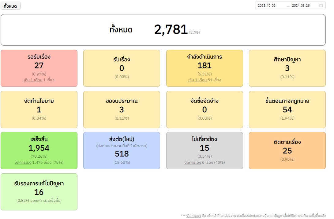 ![]() | 27-03-2024 | 75.00 | ![]() | ผลการดำเนินการแก้ไขเรื่องเรียนผ่านระบบ Traffy Fondue ระหว่างวันที่ 2 ต.ค. 66 - 26 มี.ค. 57 มีรายละเอียดดังนี้ รอรับเรื่อง 27 (0.97%) / รับเรื่อง 0 (0%) / กำลังดำเนินการ 181 (6.51%) / ศึกษาปัญหา 3 (0.11%) / จัดทำนโยบาย 1 (0.04%) / ของบประมาณ 3 (0.11%) จัดซื้อจัดจ้าง 0 (0%) / ขั้นตอนทางกฎหมาย 54 (1.94%) / เสร็จสิ้น 1954 (70.26%) - จัดการเอง 1,475 (75%) / ส่งต่อใหม่ 518 (18.63%) / ไม่เกี่ยวข้อง 15 (0.54%) ติดตามเรื่อง 25 (0.90%) / รับรองการแก้ไขปัญหา 16 (0.82%) | |