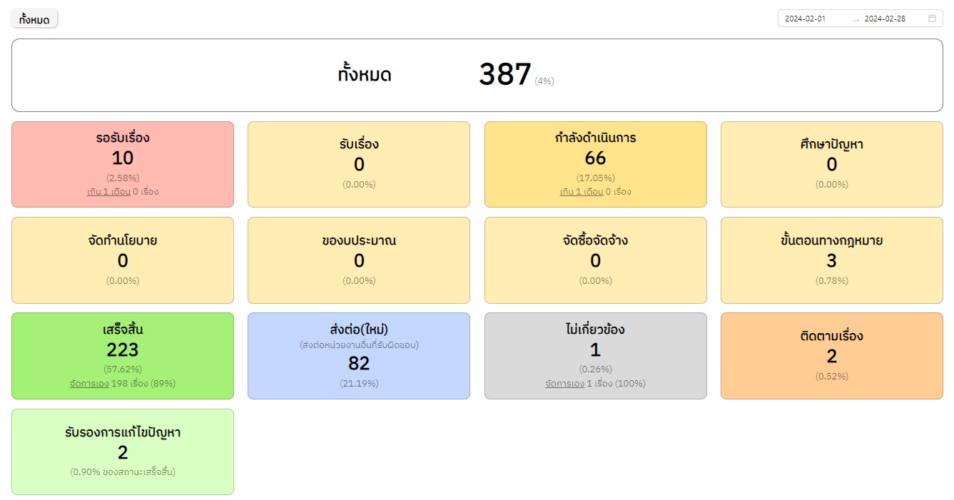 ![]() | 28-02-2024 | 89.00 | ![]() | เรื่องร้องเรียนเดือนกุมภาพันธ์ 2567 มีเรื่องร้องเรียนทั้งหมด 387 เรื่อง รอรับเรื่อง 0 เรื่อง (0.0%) กำลังดำเนินการ 66 เรื่อง (17.05%) ส่งต่อ(ใหม่) จำนวน 82 เรื่อง (21.19%) เสร็จสิ้น จำนวน 223 เรื่อง (57.62%) จัดการเอง 198 เรื่อง (89%) | |