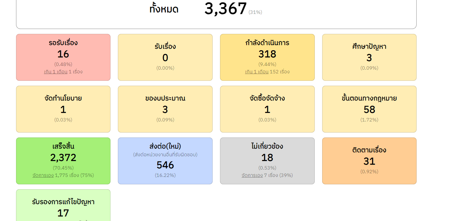 ![]() | 29-04-2024 | 75.00 | ![]() | ผลการดำเนินการแก้ไขเรื่องเรียนผ่านระบบ Traffy Fondue ระหว่างวันที่ 2 ต.ค. 66 - 29 เม.ย. 67 มีรายละเอียดดังนี้ รอรับเรื่อง 16 (0.48%) / รับเรื่อง 0 (0%) / กำลังดำเนินการ 318 (9.44%) / ศึกษาปัญหา 3 (0.09%) / จัดทำนโยบาย 1 (0.03%) / ของบประมาณ 3 (0.09%) จัดซื้อจัดจ้าง 1 (0.03%) / ขั้นตอนทางกฎหมาย 58 (1.72%) / เสร็จสิ้น 2,372 (70.45%) - จัดการเอง 1,775 (75%) / ส่งต่อใหม่ 546 (16.22%) / ไม่เกี่ยวข้อง 18 (0.53%) / ติดตามเรื่อง 31 (0.92%) / รับรองการแก้ไขปัญหา 17 (0.72%) | |